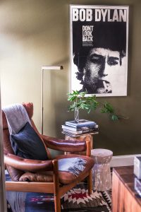 BY Rebecca Sherman //In the study, Van Hayes’ vintage Bob Dylan poster from Santa Fe. The Navajo rugs belonged to Tracy Achor Hayes’ parents. Chair from Antiques Moderne.