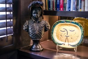 A leggy marble-topped Italian table that belonged to a favorite aunt in Wichita Falls resides in the living room and holds a sumptuous collection of giant clamshells, coral, crustacean shells, and minerals. In the entry, a series of bird prints bought at an antiques fair in London’s Battersea Park hangs above a chrome zebra bench — a souvenir from her time in Florence.