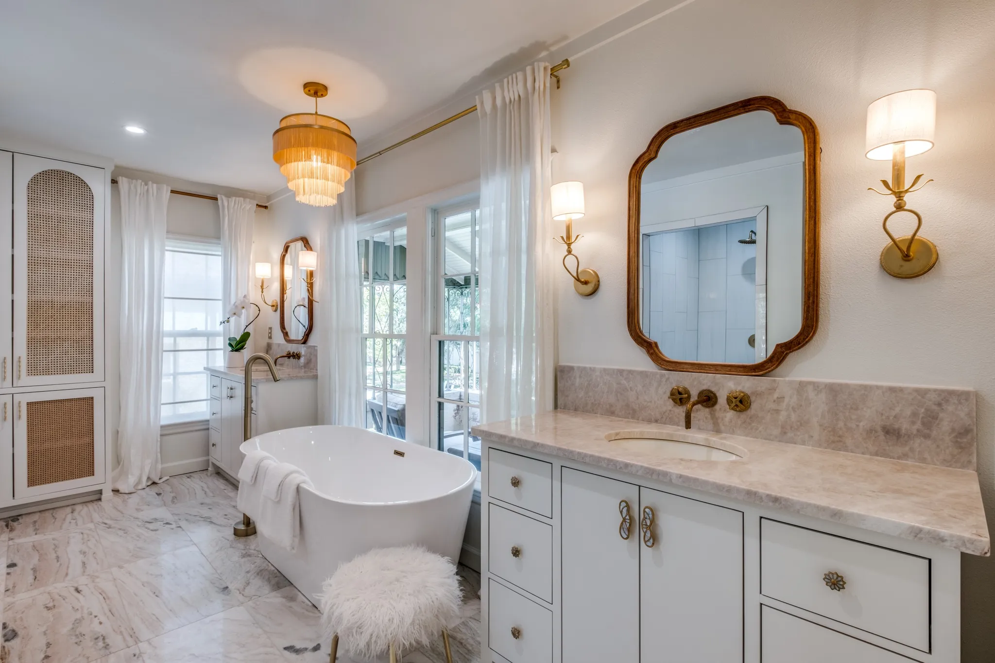 Much like the Ricos’ floral arrangements, their additions to the home are works of art. Showstoppers in the kitchen include a Taj Mahal quartzite island, herringbone terracotta tile, and a French La Cornue range. The primary bathroom features a fringed chandelier, romantic drapes, and a slick standalone tub.