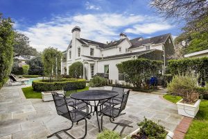 Cosseted behind a towering hedge and secured behind wrought iron gates, the property feels larger than the half acre it occupies. A circular motor court in the front of the house leads to a two car garage while a flagstone terrace in the backyard overlooks an Old World swimming pool and manicured gardens, a beautiful throwback to a bygone era.