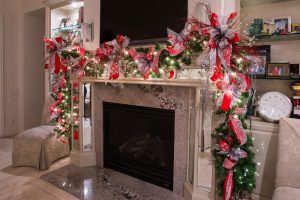 And that’s just the beginning. A life-sized Santa and a life-sized father Christmas are part of the decorative them as are ribbons, holly and ornaments wrapping the curving stair rail. Three mantles are decorated to the hilt as is the triple alcove above the ovens in the kitchen. Needless to say, the Christmas fantasy extends throughout the house. While Cynthia is a talent, the job could not be done single-handedly. Richard Flowers and The Events Company team spent a number of days helping with the decorative assembly.