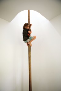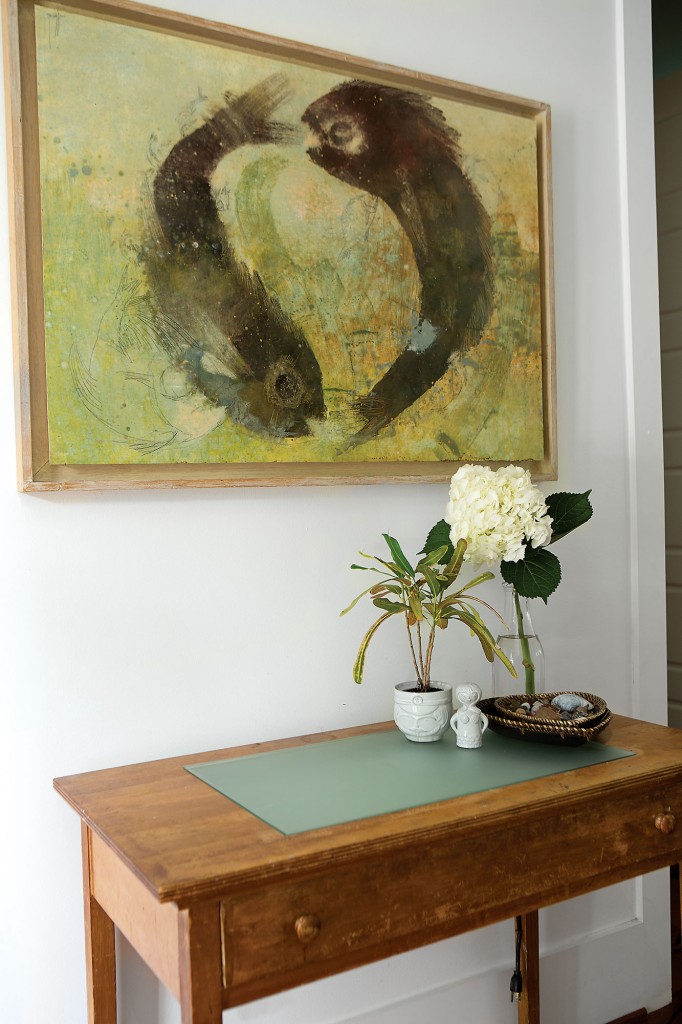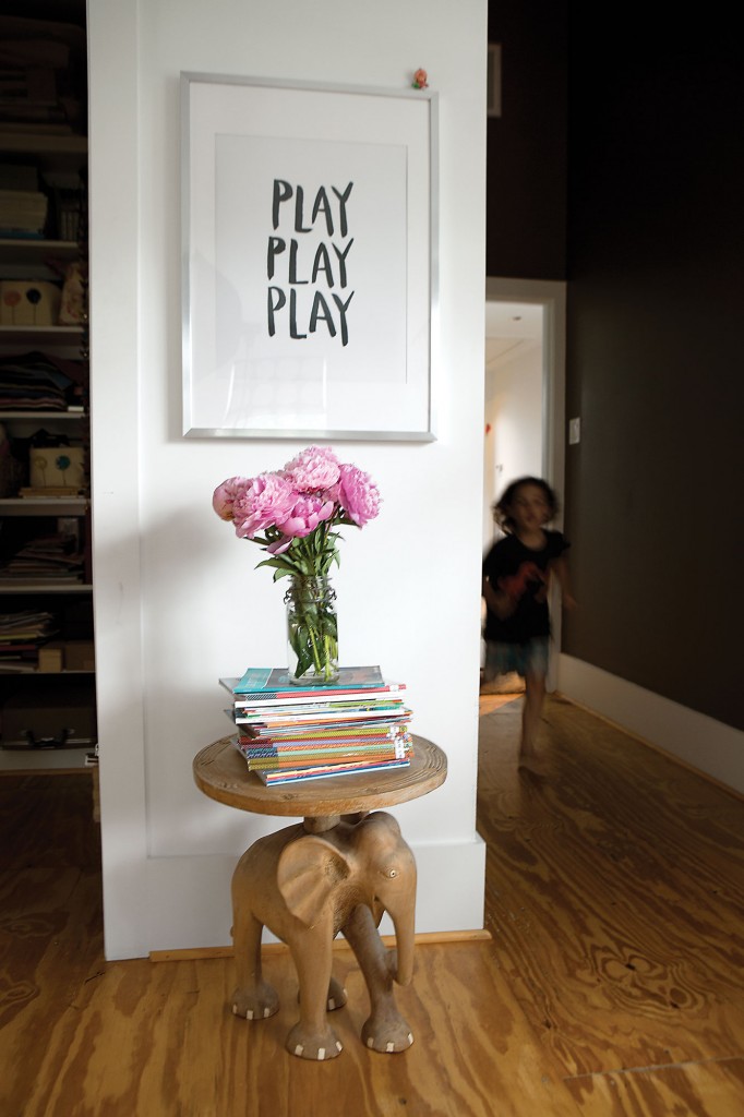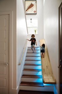 Jill: From our first meeting with Joe, we knew that we wanted to do some really fun and different things, like putting in a fire pole from the second floor down to the first, and installing a slide on our stairs. We like playful things, and we don’t like to take ourselves too seriously. What we didn’t know is how hard it is to do fun and different things when building a home! But Wooch found some very nice firemen (seriously) and got some great information concerning our fi re-pole installation. And we found artist Sam Jones, who built our slide, which is my favorite permanent fixture in our home. It’s made of old bowling-alley fl oors that Sam carved and sanded to fit perfectly. It’s truly amazing. And, every morning, our kids go down it in their pajamas on their way to breakfast. My father, Pat [Smith], who is a retired landscape architect, came up with a brilliant idea of a 360-degree pass-through area behind secure gates for safe play, protecting peace of mind, dogs and kids.