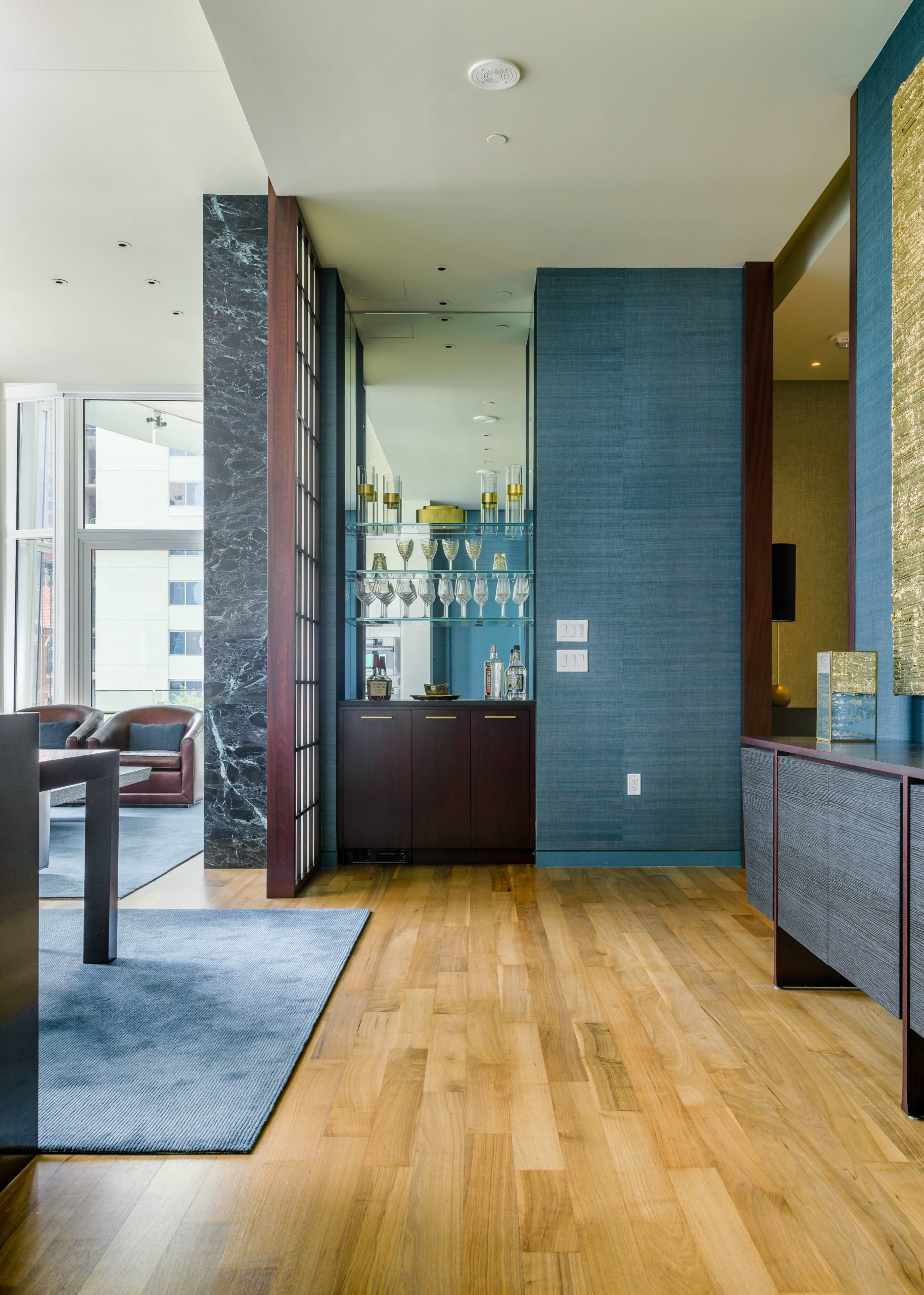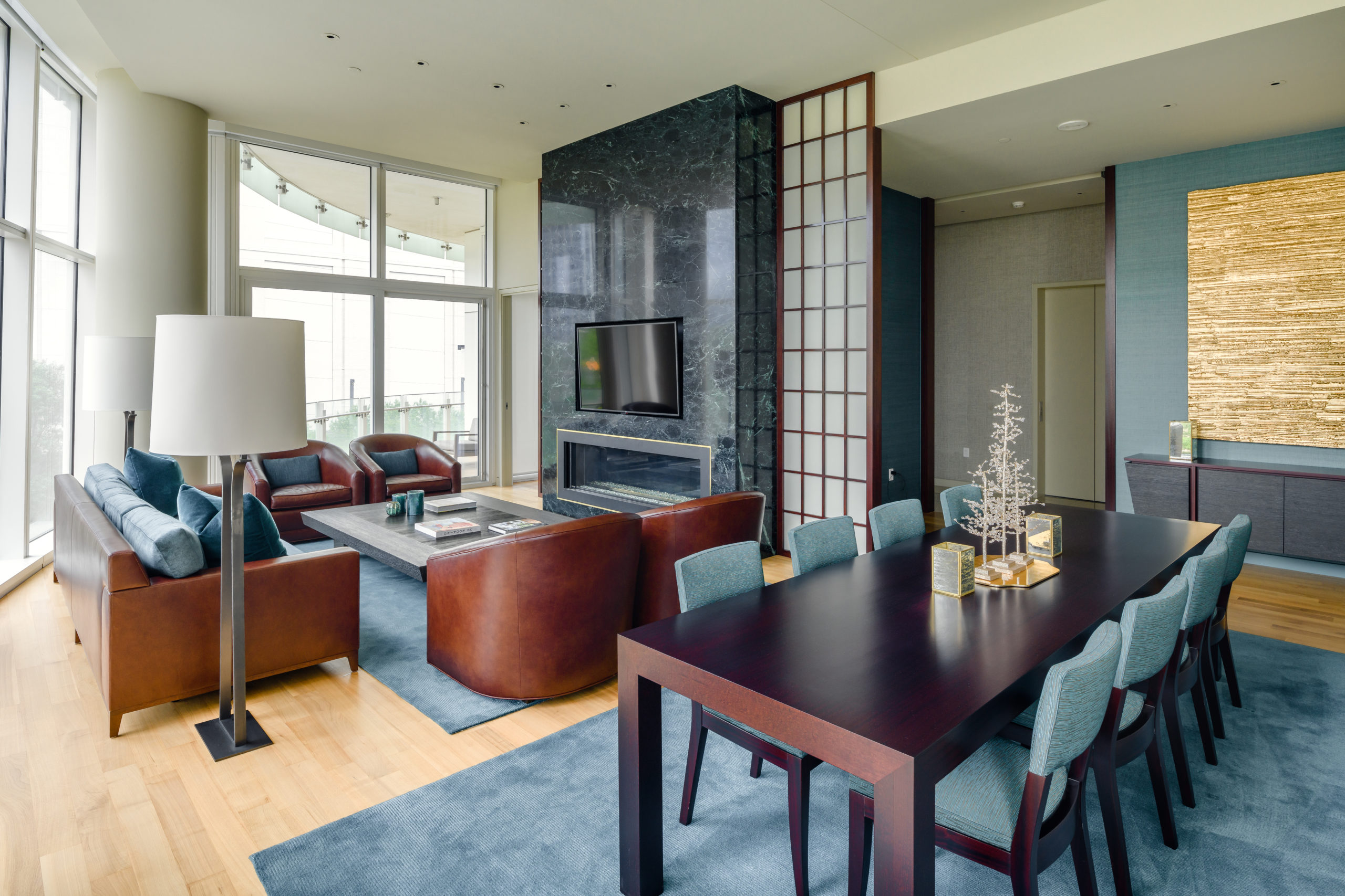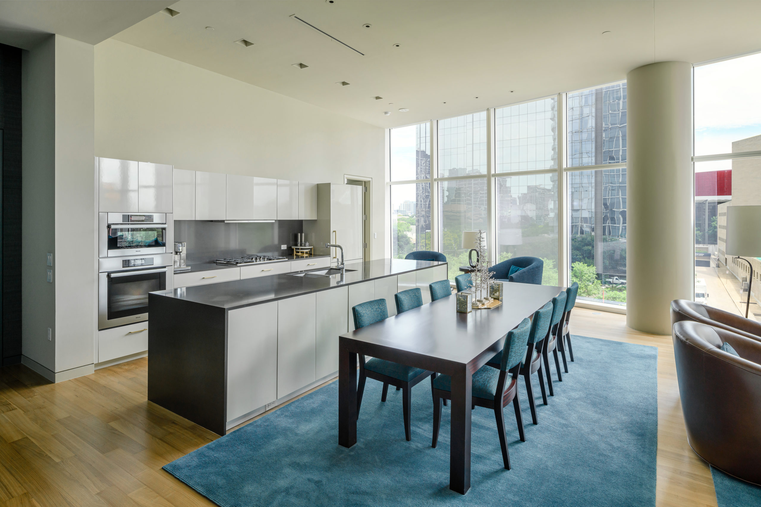 Flooring includes stylish gray tones in the entry space, and honey-hued white oak throughout. Windows stretch floor to ceiling, allowing residents to soak up the city views. Pops of teal flow from accent walls to the modern lounge seating.
