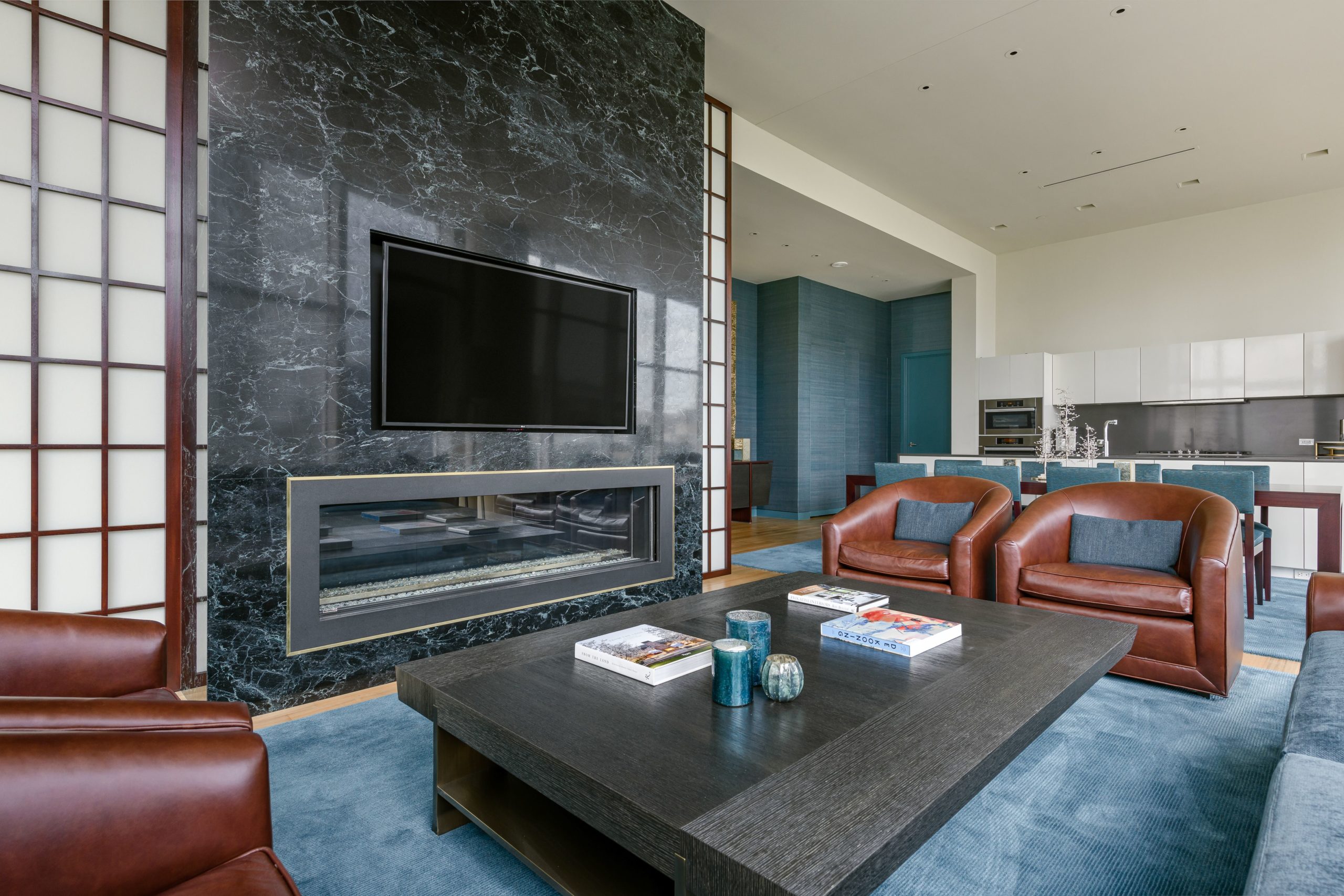 The luxurious kitchen is open to the living and dining rooms with unobstructed views — and its convenient island includes a waterfall counter top. Architectural faucets and fixtures are by Dornbracht, with a full suite of Miele appliances and European style high-gloss cabinetry with soft closures.