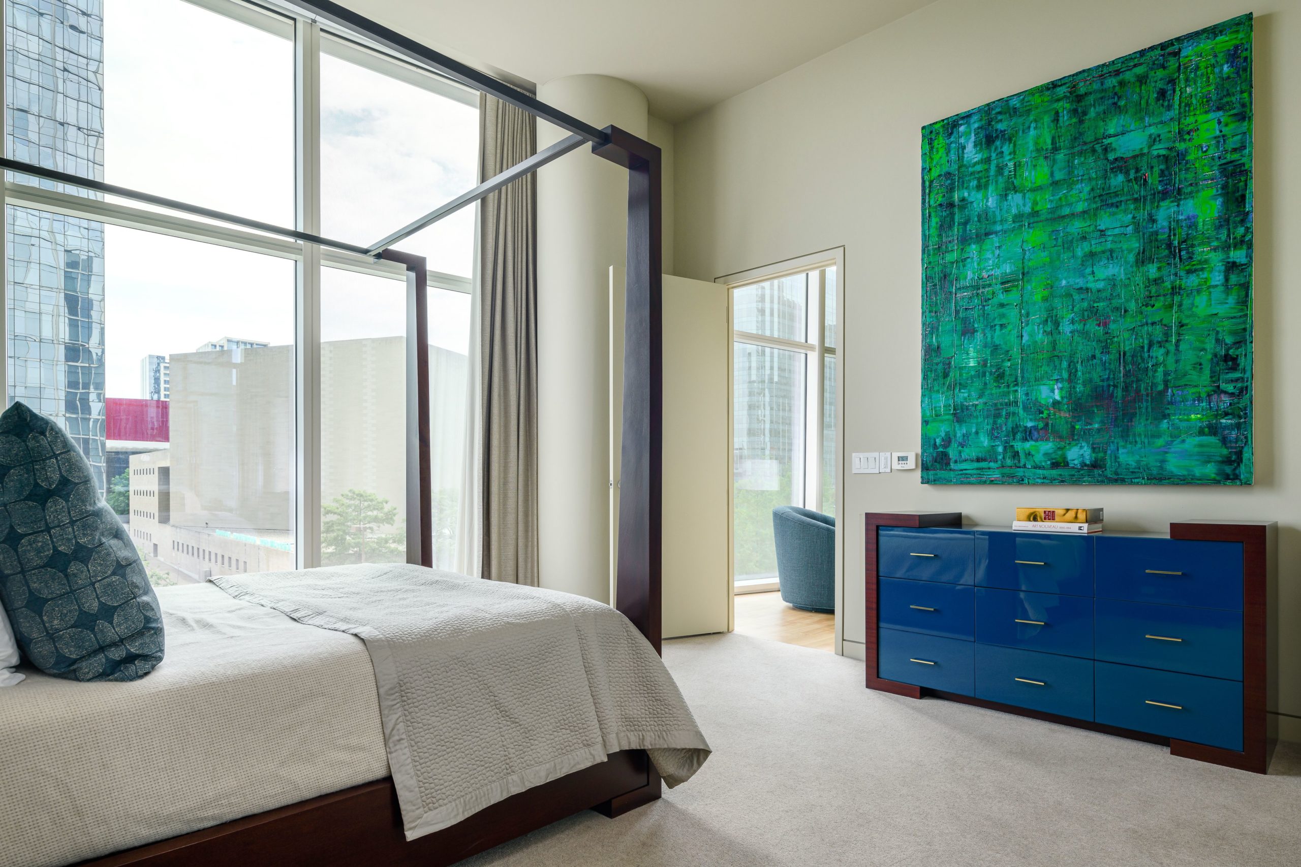 It’s easy to get inspired in such surroundings. Elements of Museum Tower’s nearby neighbors helped chart this top designer’s course.