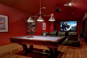 The vast, roomy living room offers space for several couches, chaises, and chairs. It looks out onto the sparkling pool and spa. A sophisticated wet bar sits at the back wall with plenty of room for spirits and glassware on sprightly nights.