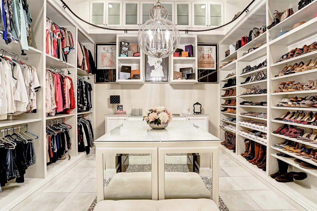 The house might even make living outside the loop worth it, with a game room, a fitness room, pet grooming area and the most immense his-and-hers closets you can imagine. Her dream closet even features a chic chandelier.