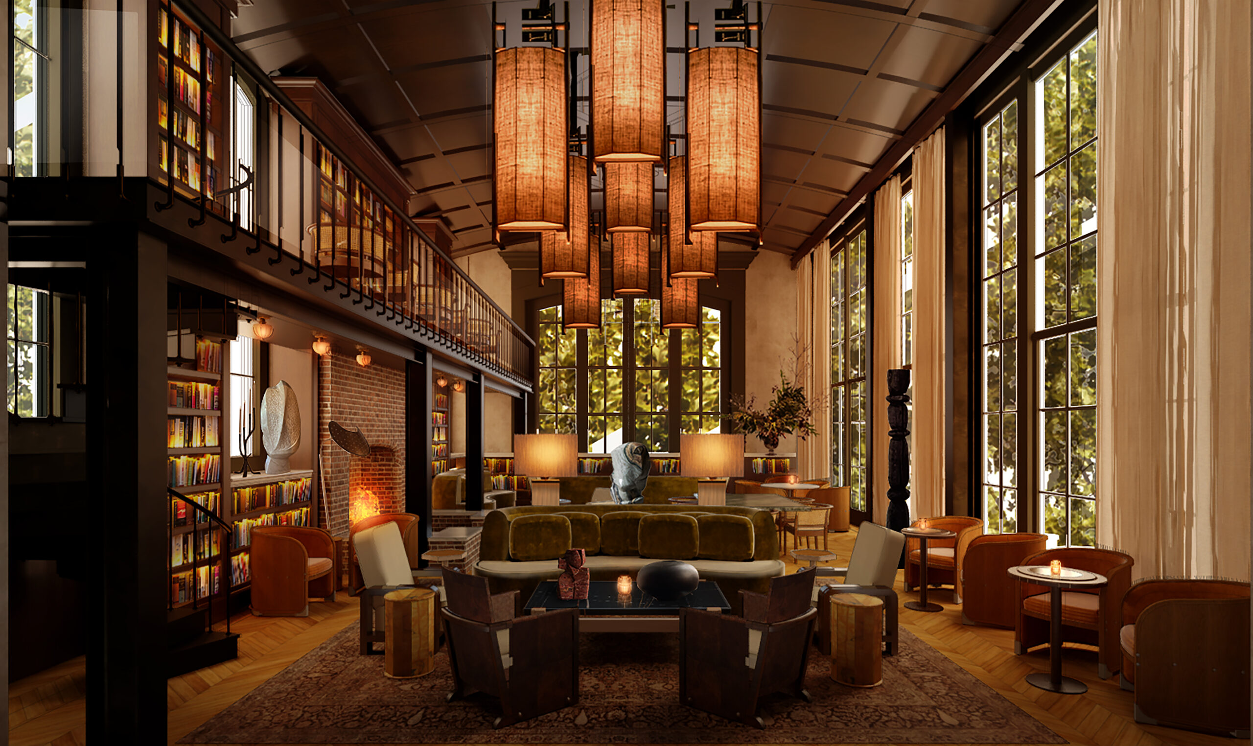 Within the members-only spaces for hotel guests, residents, and club members — which include a cafe, walled garden, and living room — is a grand double-height library with a fireplace that recalls historic European homes of collectors and intellectuals. In the public Auberge restaurant, a hand-painted mural frames the open kitchen echoes the wooded view through the restaurant’s windows. In the guest rooms, doorways are trimmed with oak millwork for the kind of warmth that only wood can provide. Every aspect is having a conversation with the landscape, the history of the neighborhood, and the future of what this new cultural hub will become.
