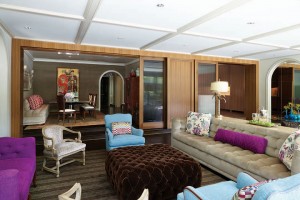 Finding the right colors took time. Despite the wife’s passion for lively hues, she’d drenched the living room walls in gray. “Paul brought in several combinations, including ivory and aqua,” she says. “None of them were right. One day, he showed up with all lilac and orange, and I loved it. He had noticed I wore the same lilac workout shirt all the time, and I mentioned I’d have a whole house in lilac if I could. The next thing I knew, I had almost a whole house in lilac. It turned out [my husband’s] favorite color is purple, and I had no idea. Thank God it is, because there’s a lot of it. It’s a spiritual color for me, so I never tire of it.”