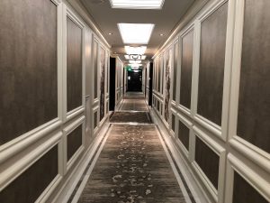 The chandeliers are a hallmark of the suite. Descending from the living room’s silver-leafed ceiling are 300 individual strands of crystal that form two waterfall chandeliers. The showcase lighting in the master bedroom is comprised of more than 400 uniquely shaped crystals from Italy and above the dining room table more than 300 agate stonesare suspended from metal branches covered in gold leaf. This element of glitz is tempered by the taupe and ivory tones of upholstered pieces and carpets and the ebony-hued floors, woodworking and doors.