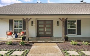 The mid-century ranch house is simple and understated with hints of Texas flair. The exterior is modern but homey with white painted brick, black shutters, simple wooden columns, and a narrow porch.