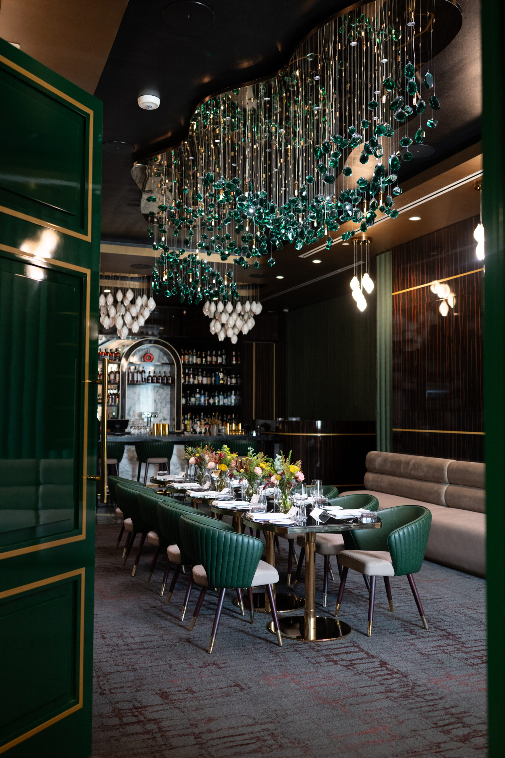 Setting the stage for Bar Moon and Soleil, grandeur reigned. The second floor elevator arrives to a plush foyer where walls are upholstered in emerald green velvet and lacquered emerald green doors flank the hostess desk. One door leads to Bar Moon and the other to Soleil.