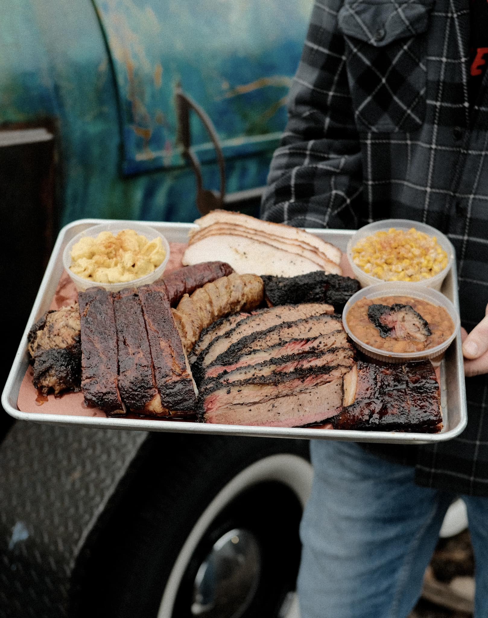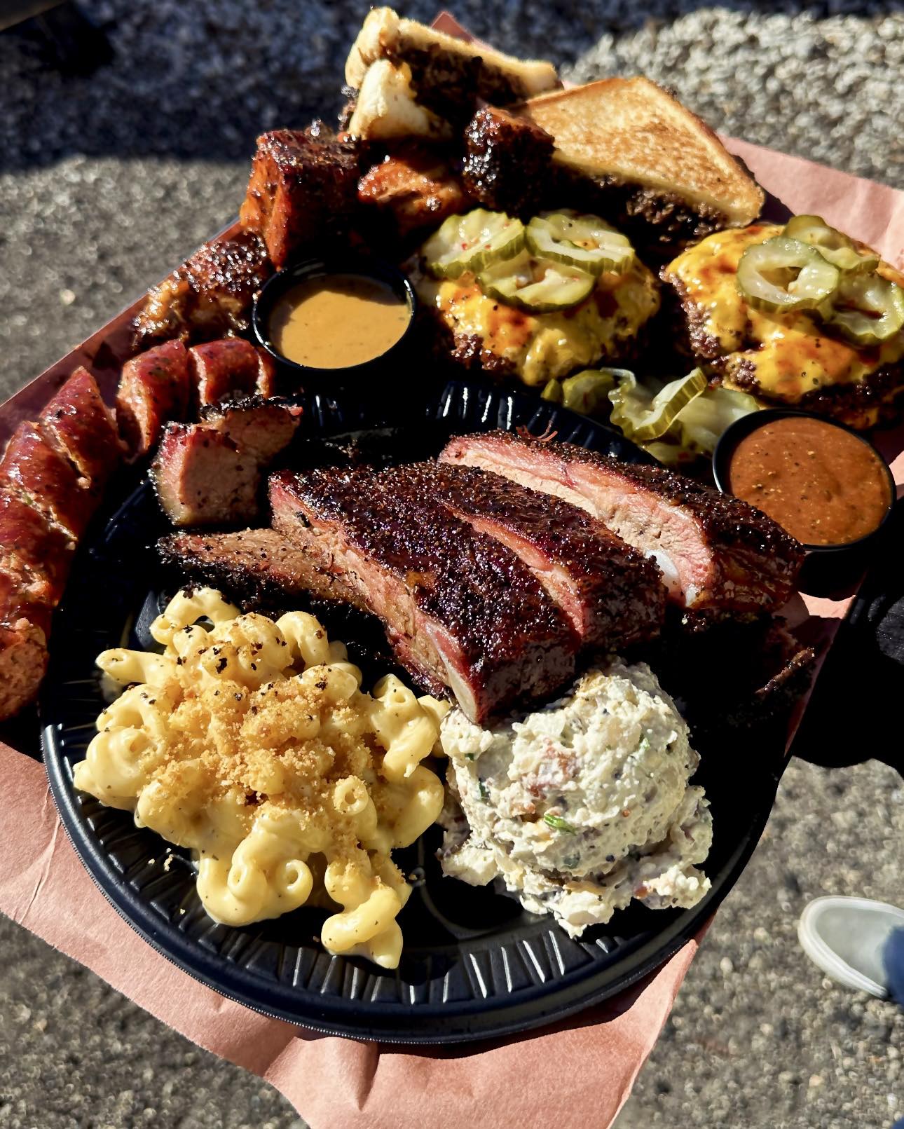 What To Order: The family pack feeds eight to 10 people and includes brisket, ribs, turkey, sausage, three quarts of sides, and tallow chocolate chip cookies. There are also specials such as smash burgers and brisket elotes.