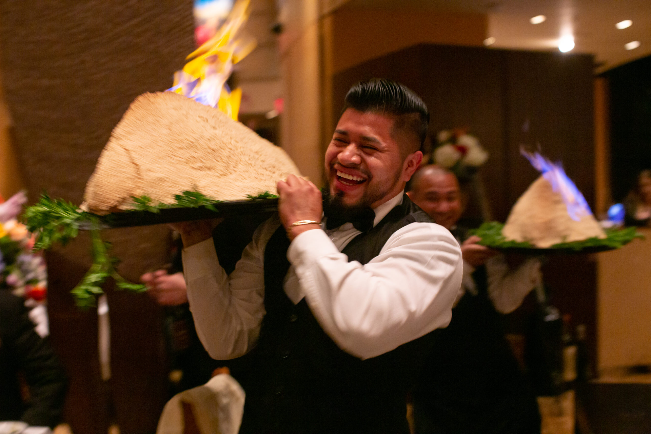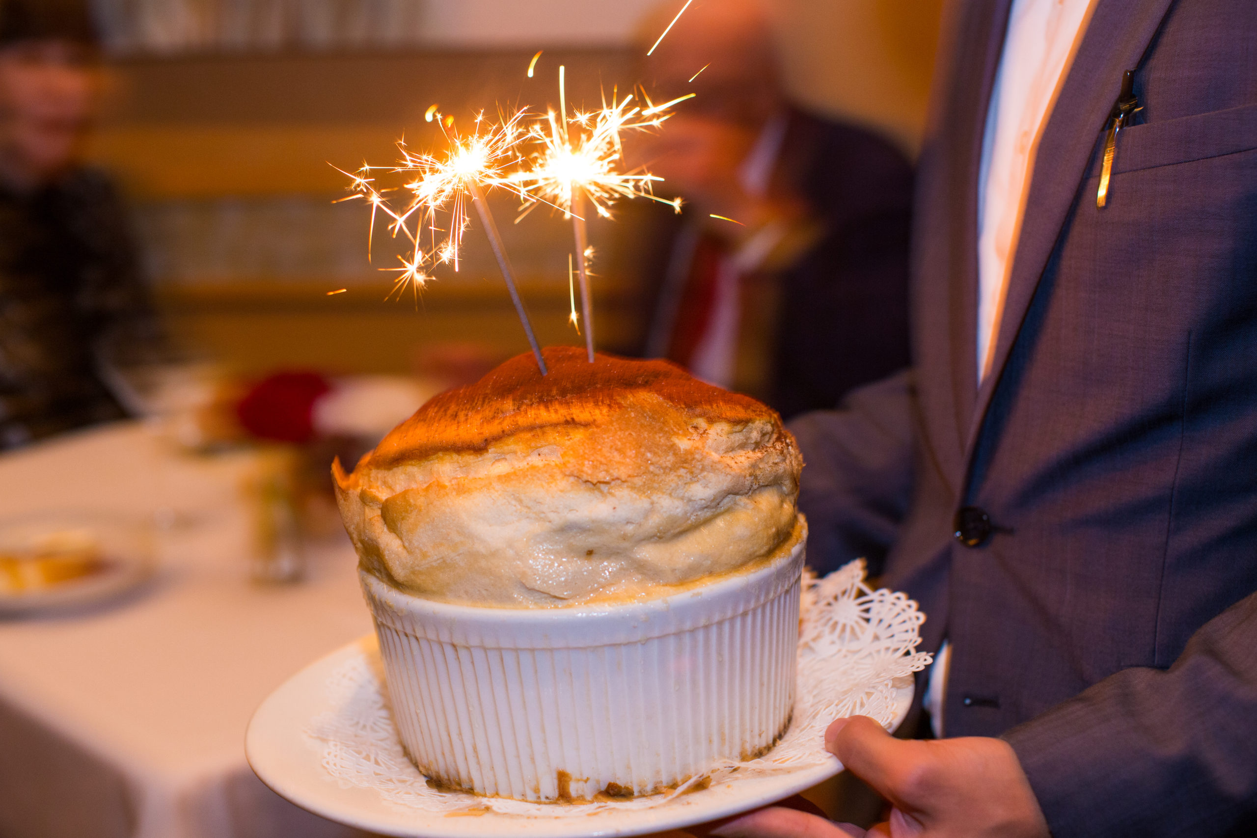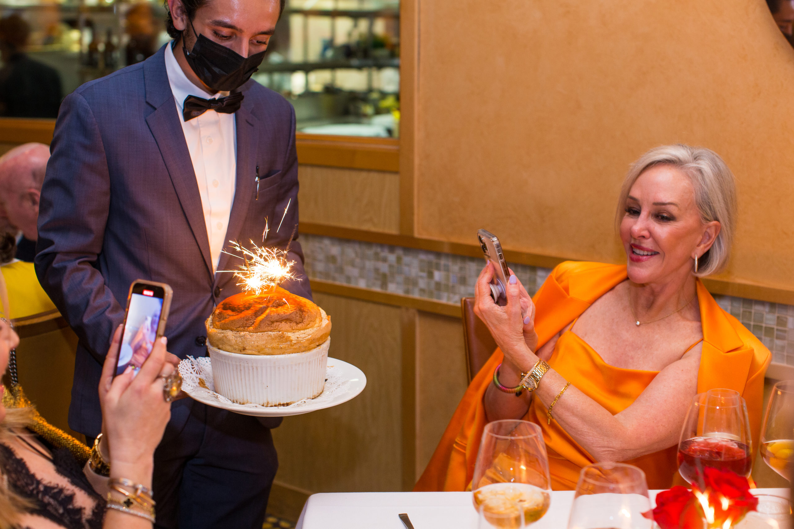 Surprises were promised and the team delivered. Guests were treated to first servings of caponata in Reggiano cups followed by Tony’s famed flaming salt-crusted red snapper with Barolo wine sauce. For the presentation, waiters paraded through the open dining room carrying platters of the flaming fish, guests applauding. From there diners had their choice of entrees including the roasted Long Island Duck and escargot and bone marrow. In the end, the lucky dinners had their choice of Tony’s favorite desserts — either apricot or tiramisu soufflés.
