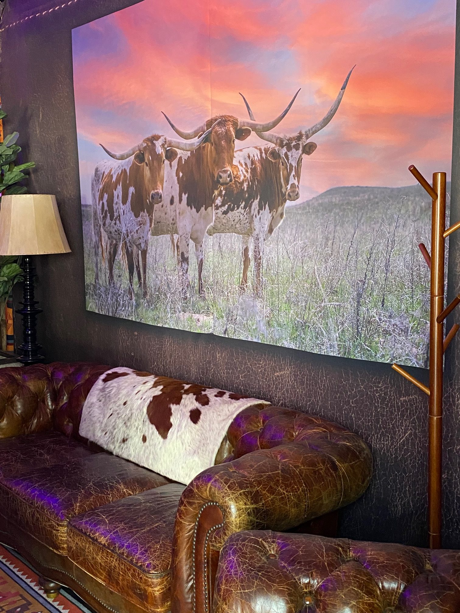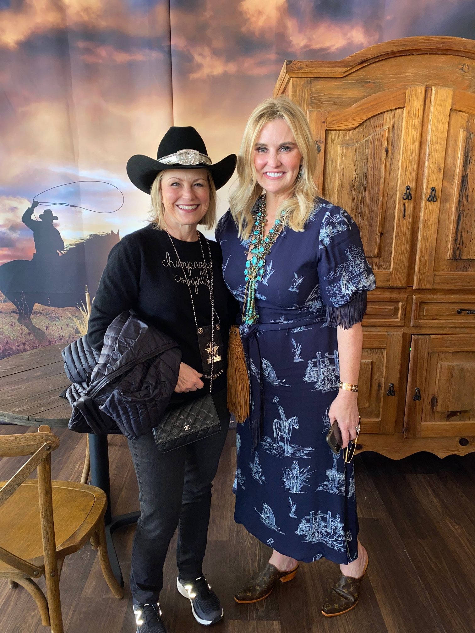 Heading the fashionable entourage on this day was Champagne Cowgirls founder Ellie Francisco, who was presented the champion junior market steer hide from the 2021 auction by Steer Committee chairman Sean LeHane. In their signature black Western hats with interlocking rhinestone C’s headbands, they group had chartered a bus from Tootsies for the jaunt to NRG park and The Ranch Saloon + Steakhouse opening.
