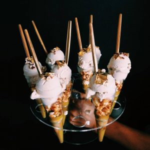 The ice cream itself is completely dairy-free, made with an organic coconut milk base. Then fruits and rich ingredients are added along with alcohols like rum, champagne, and Guinness. The finished product is adorned with sauces, toppings, and pretty garnishes.
