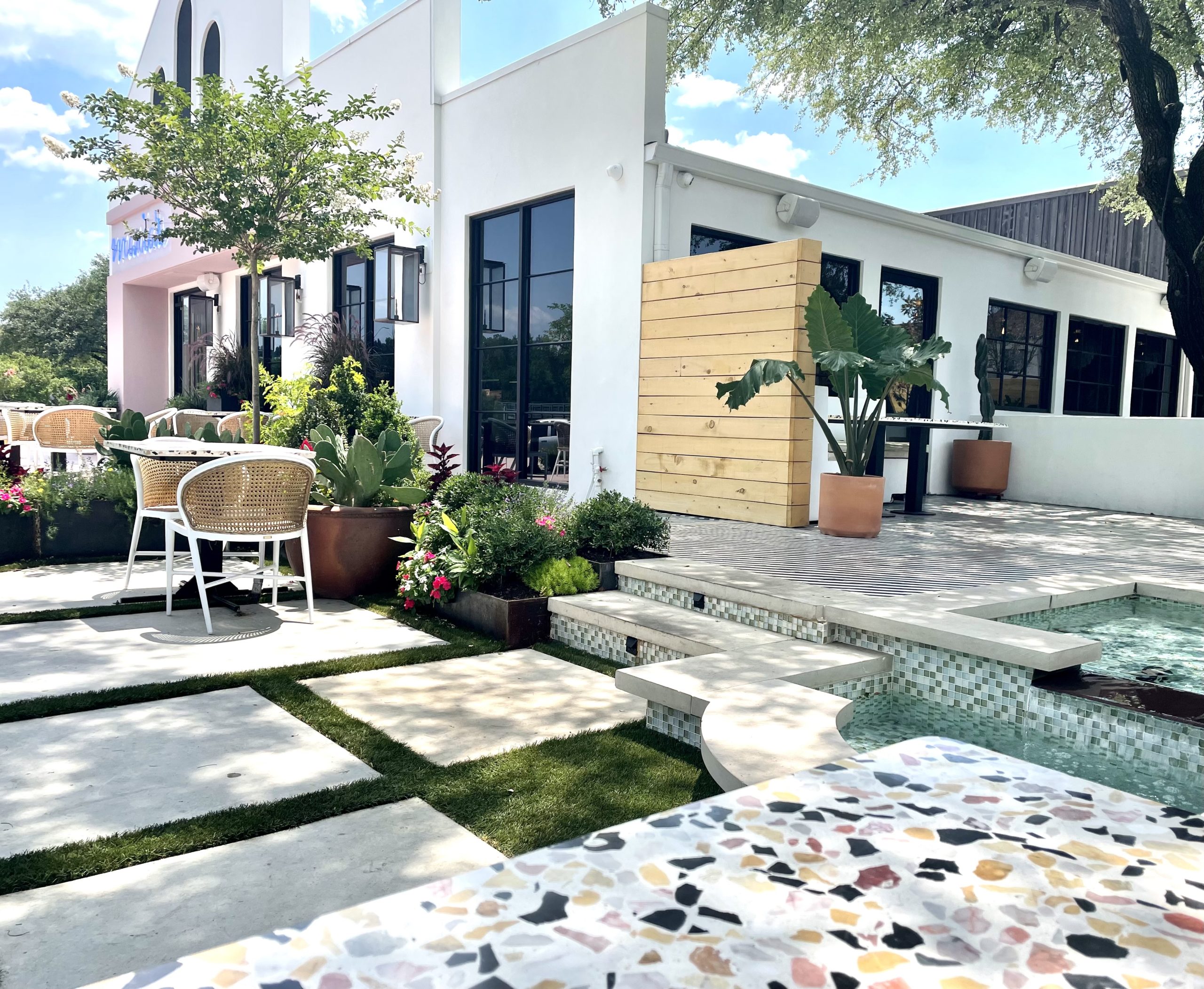The new Fort Worth restaurant’s façade is reminiscent of a white-washed Spanish mission. To the right hand side is a shady and tranquil patio with its own water feature and plenty of eye-catching tile work.