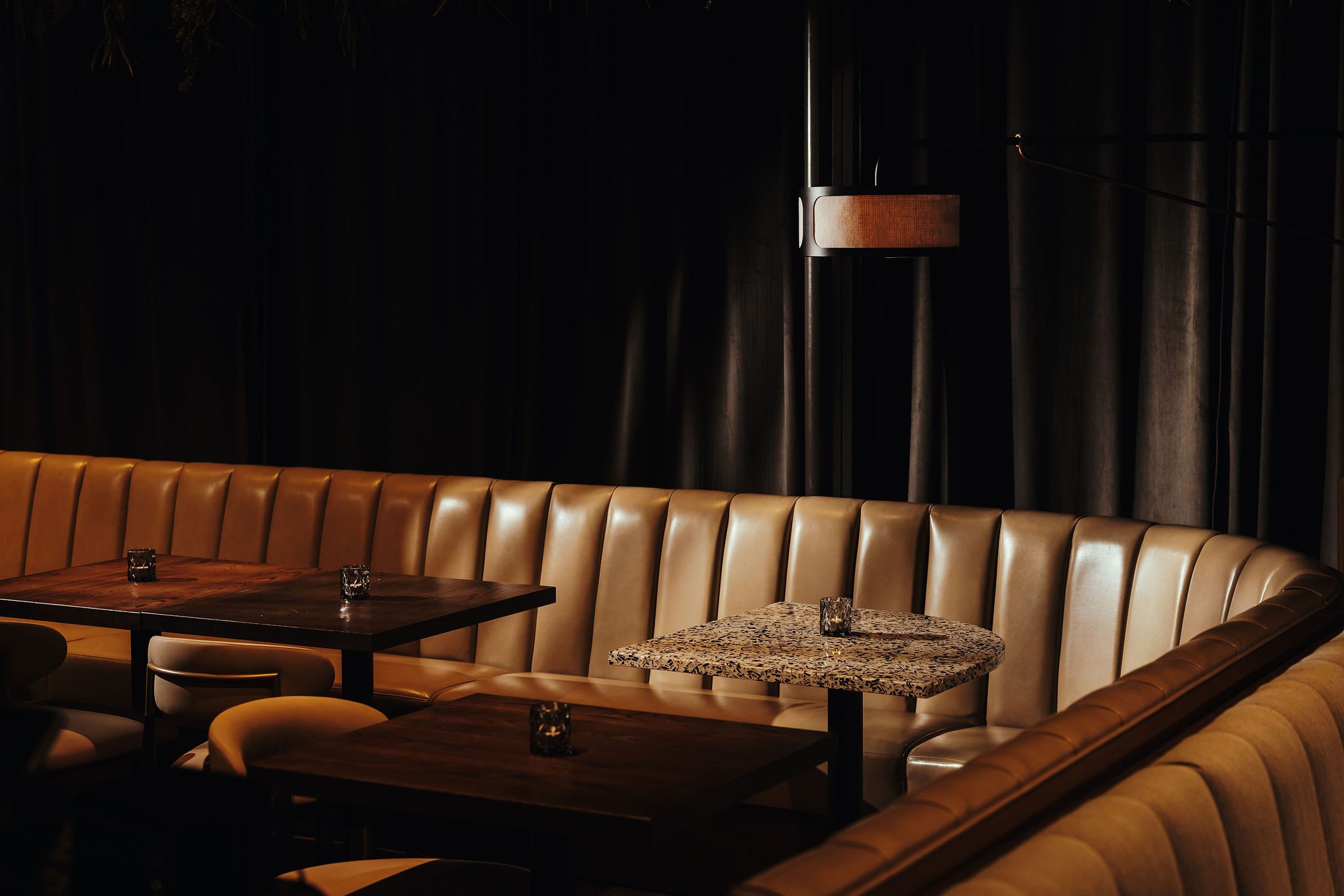 Meridian’s refreshed interiors include dark velvet green drapery (blocking any sense of the outside world), a custom backlit art installation, gold accents, new lounge seating, a chef’s table beneath a raindrop-inspired chandelier, and an expanded patio. Since our first visit in 2021, the space now has a more relaxed, cozy, and cool vibe.