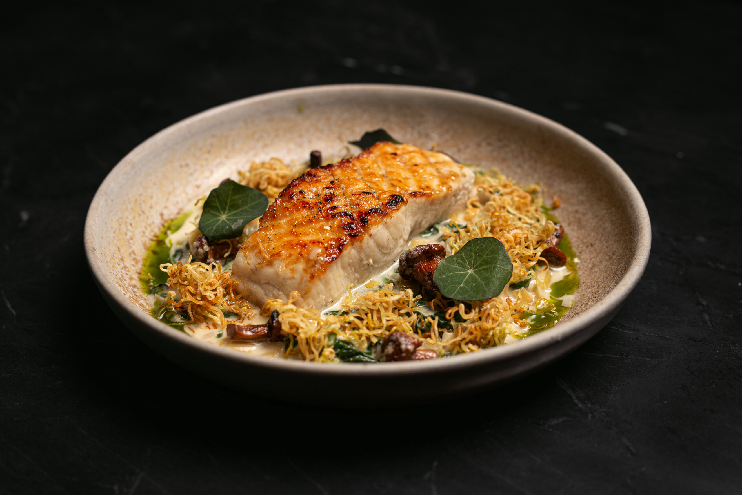 There’s an entire section on the menu dedicated to dishes that are live-fire cooked, including Sakura pork, duck breast, embered roasted branzino, a wood-fired half chicken, and hearth roasted turbot.