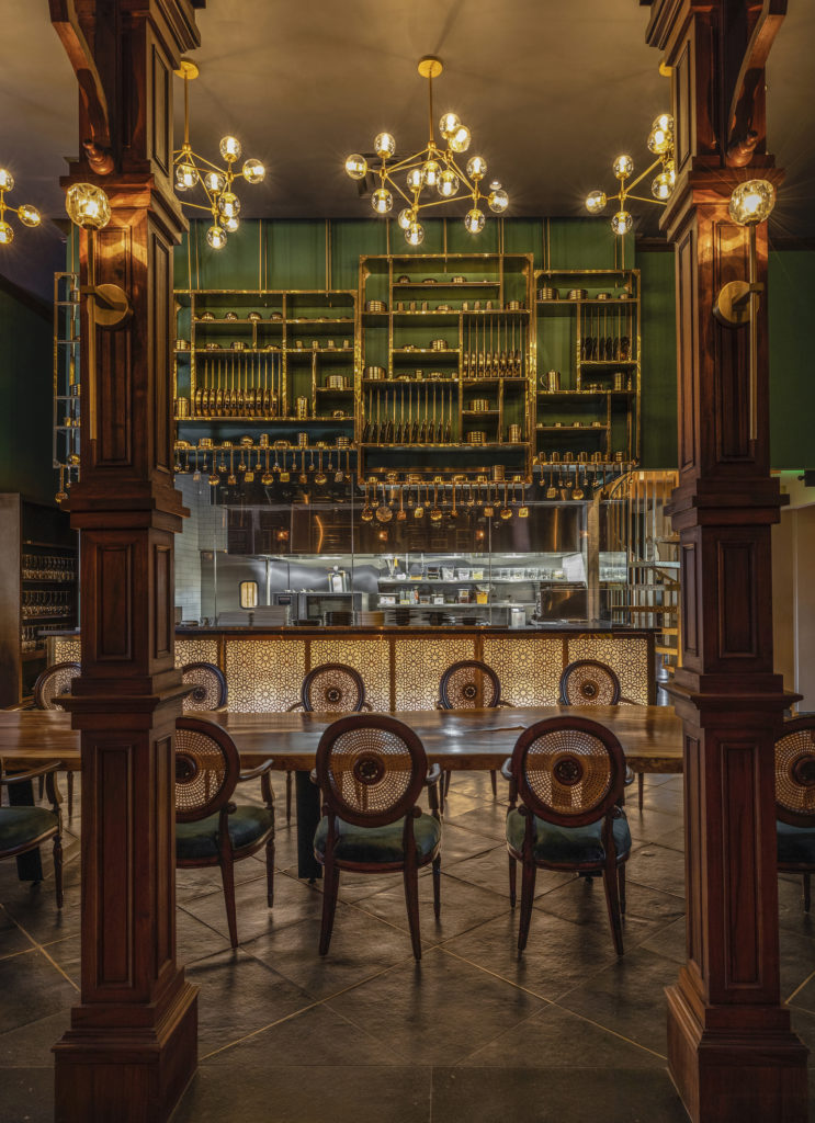 Focal point of the restaurant is the Traveler’s Room that emulates a market with 16-foot carved wooden colonnades, 25-foot-long Dhokra wall featuring brass castings of folk motifs in decorative frames plus a window into the kitchen, framed by a whimsical brass sculpture incorporating a massive rack of pots, pans and utensils.