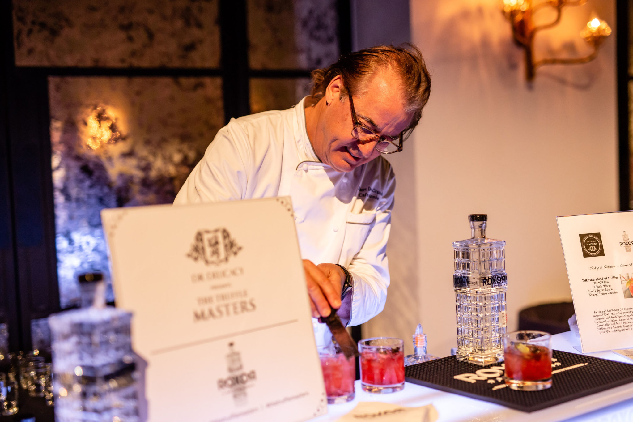 The evening included tastings of Texas olive oil from 1836, Gloria Ferrer’s bubbly, Kagan Cellars wines, Crooked Fox bourbon and Robert Del Grande’s truffle-laced Roxor Gin cocktails. Who knew that Del Grande’s gin would be such an elegant platform for Q tonic, beet juice, shredded truffles and a pinch of lime?