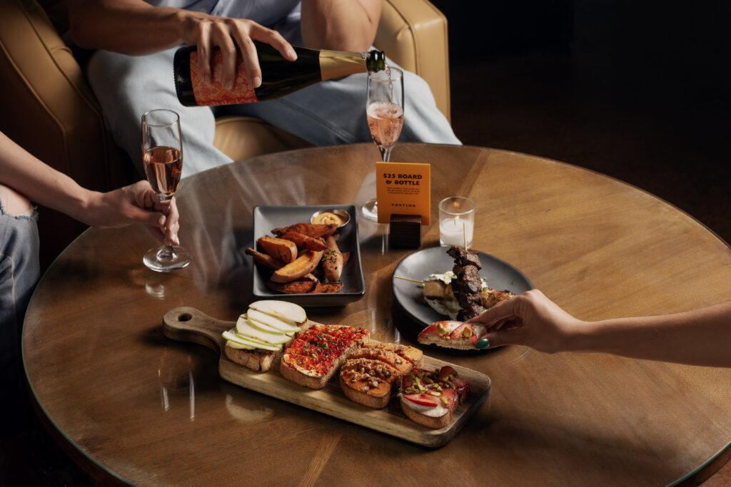 You can pair a glass with artisan cheese flights, sharing plates or the truffle cheese fondue. On Thursdays at Cru, bottles of champagne are even half price.