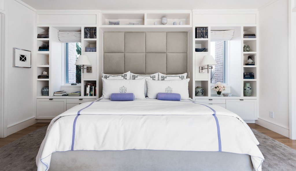The furnishings contribute yet another layer of sophistication — an artful mix of custom pieces designed for the house by Leib and Jeffrey Lee of Grange Hall, along with the couple’s existing furniture, including an Yves Klein coffee table in the living room, an Andrée Putman settee attending a vintage Paul McCobb table in the dining room, and classic designs by Warren Platner, Mies van der Rohe and Knoll scattered throughout.