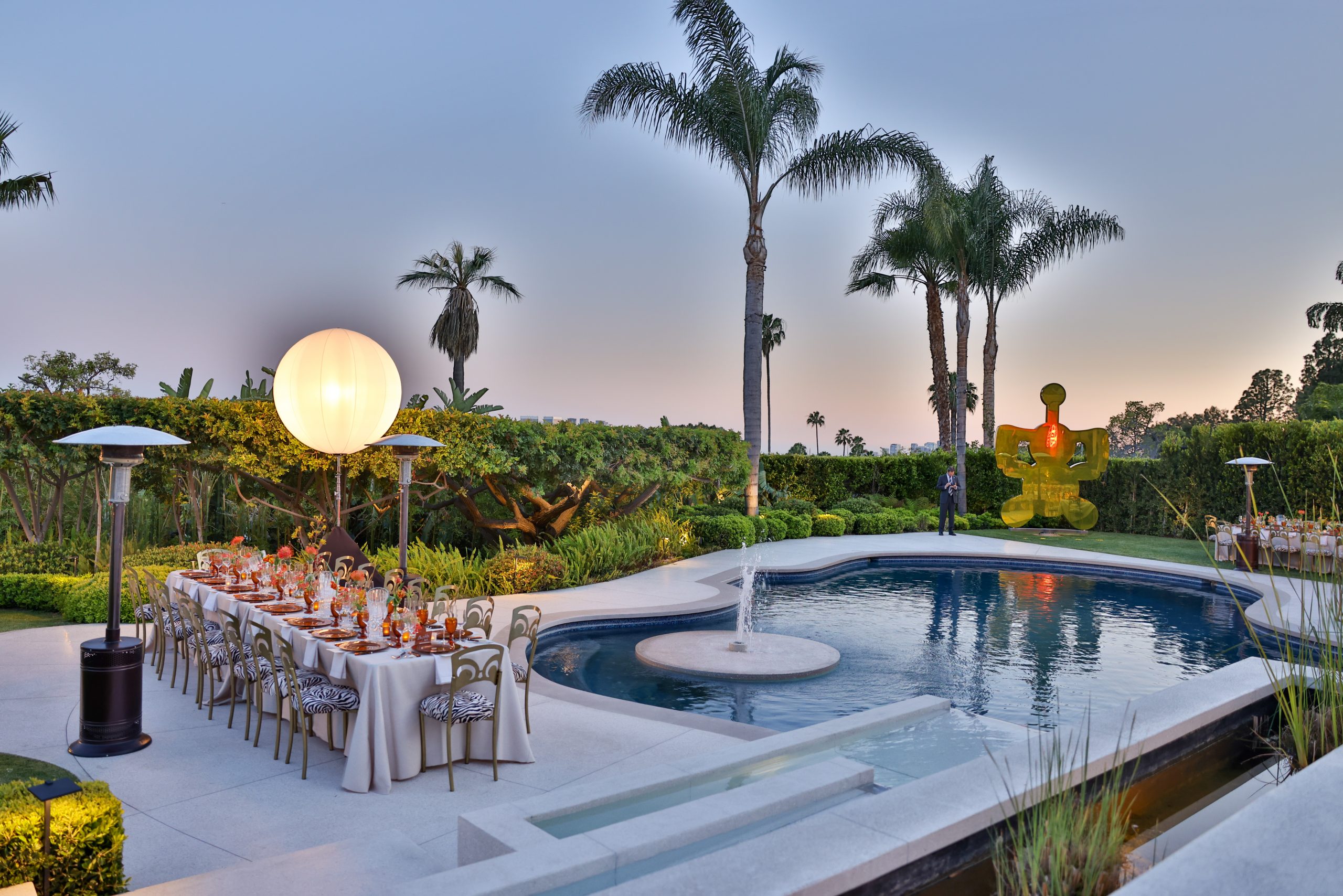 As the soigné crowd meandered through the home making their way to dinner, they marveled at the works on view by Richard Prince, Donald Judd, Cy Twombly, and Andy Warhol. Handsome NYC-based interior designer Lance Scott remarked, “The art is insane. Those Louise Bourgeois spiders were a sexy prelude for this magical poolside dinner.”