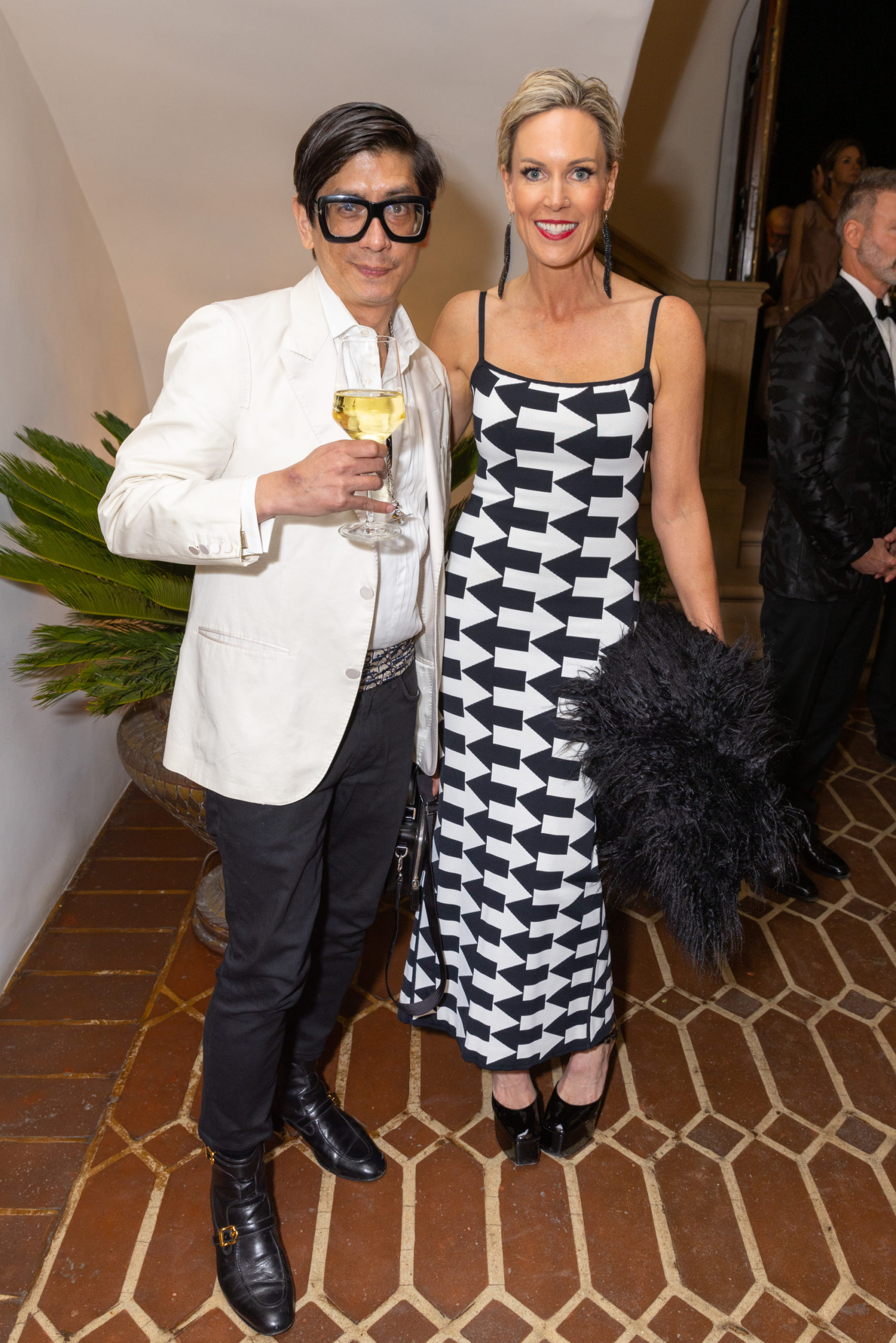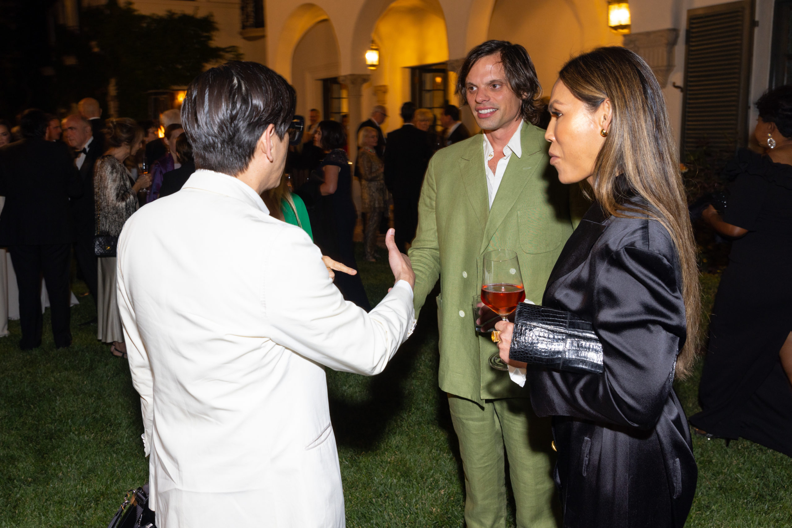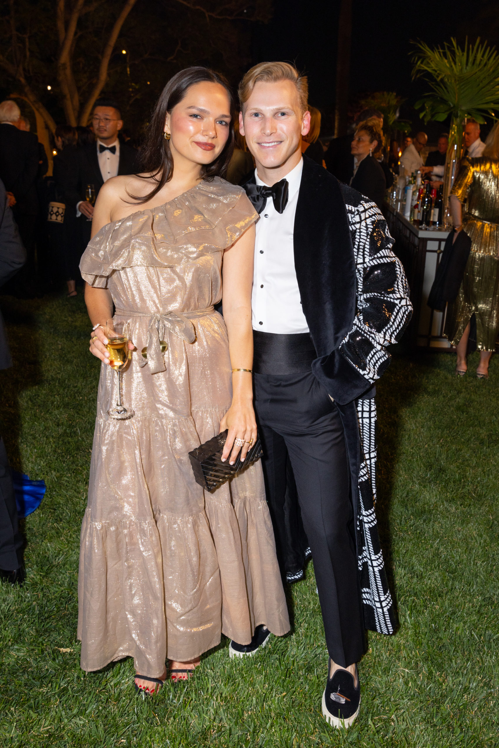One of my party recaps wouldn’t be complete without accolades for those who came wearing their A-game. First off, Moll Anderson, at the Bells’ party in an emerald-green slip dress topped with an entrance-making kaftan-style robe from La Vie Style House. Moll’s son, Mike Camello, had generously provided Kástra Elión Vodka (the company he co-founded), and was there with his gorgeous wife, Aphrodite. Lance Scott went with the top two Toms for both evenings: head-to-toe Thom Browne (is there any other way to wear the king of shrunken suits) for the night at Eugenio’s and Tom Ford for black tie at the Bells’. Duyen Huynh Nguyen looked glorious wearing Bach Mai’s deep-V strapless column gown in Strawberry Lemonade. Ceron paired a traffic-stopping black-and-white printed Gucci jacket with marabou cuffs (from the Love Parade collection) with a long black Ann Demeulemeester skirt he’d found at Maxfield just hours prior. Finally, Crystal Lourd must have gotten a sneak peek at the color theme of the tent at the Bells’, as she opted for a stunning green Giambattista Valli.