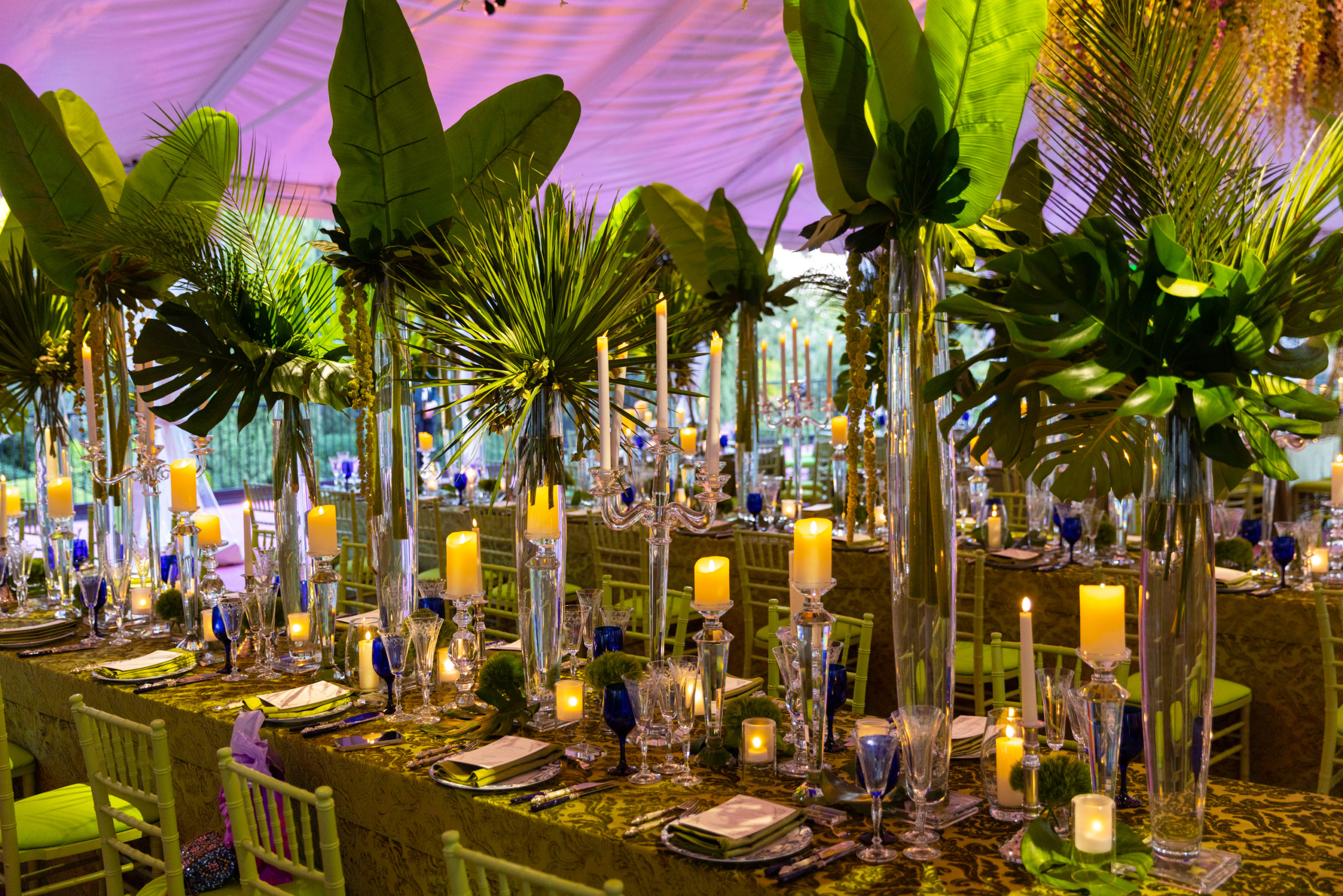 As cocktail hour waned, guests made their way to the tent, which was cinematic in design — as if we had all been transported to an era that embraced the sumptuous supper clubs. Thrash and Houston’s Richard Flowers from The Events Company designed all the parties that week. “Richard’s been by my side for 28 years,” she said. “I don’t make a move without him.” When I asked who she was wearing that evening, she responded, “It’s custom Naeem Khan. I always select an outfit and then plan the decor of an event around it. I would hate to clash.”