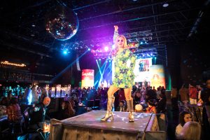With go-go boots on, hoop earrings in place, and a semi-perfect cat-eye (we’re working on it!), the night was finally here. Arriving at Deep Ellum hot spot, The Bomb Factory, we were met with a metallic runway giving off some major Studio 54 vibes. The event space was transformed into a kaleidoscopic wonder: disco balls hanging from the ceiling, Andy Warhol Campbell’s Soup structures wrapped around the DJ booths, ghost chairs for sitting, a dance floor for the taking, and a bevy of balloons patiently perched in a tent above, just waiting for their time to shine.