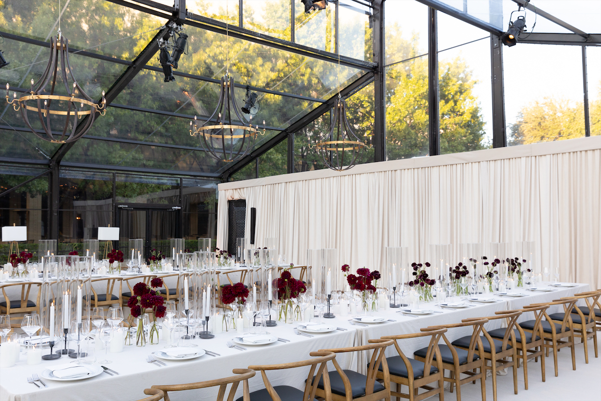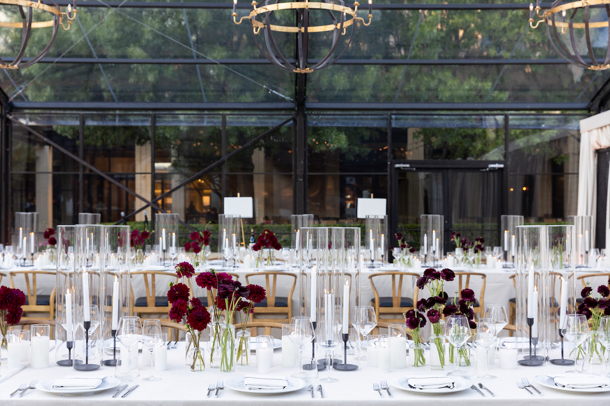 Wine-colored ranunculus adorned the two banquet tables for the intimate 40-person guest list, which included Moll Anderson, Jessica Nowitzki, and Bela Cooley. In the language of flowers, a bouquet of ranunculus says, “I am dazzled by your charms.”