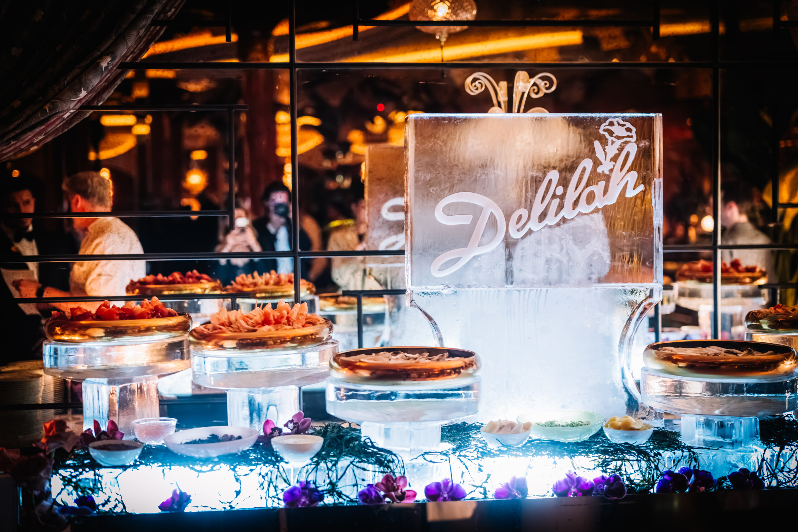 During the several hours I waited by the stage so I wouldn’t lose my spot, the Delilah party was going full-throttle around me. It was hard to focus on anything, as my attention kept getting pulled away from the live Delilah Dallas Band warming the stage up in front of a marvelous backdrop, burlesque performers dancing on several smaller stages throughout the space (and even above some of the reserved booths — mgk also hopped up there later on), a massive buffet with seafood, carving, and dessert stations, an ice sculpture, a glitzy photo op station, and the most congested of the areas — the bar offering complimentary cocktails including the Dallas exclusives: Perfume & Petals, 1616, and Hold Your Horses.