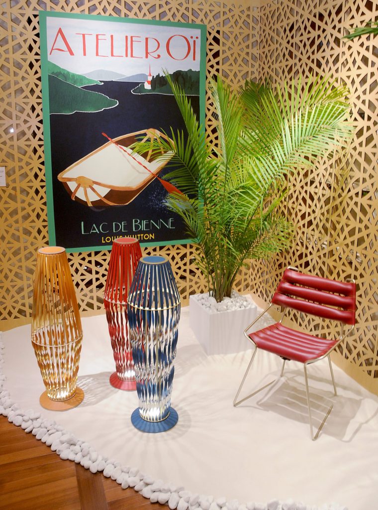 The Atelier Oï contributions to the collection began with the Taboret folding camp stool and has grown to include the swing boat sofa and spiral lamp, all of which were on display in the whimsical showroom set up midstore in the Galleria boutique.