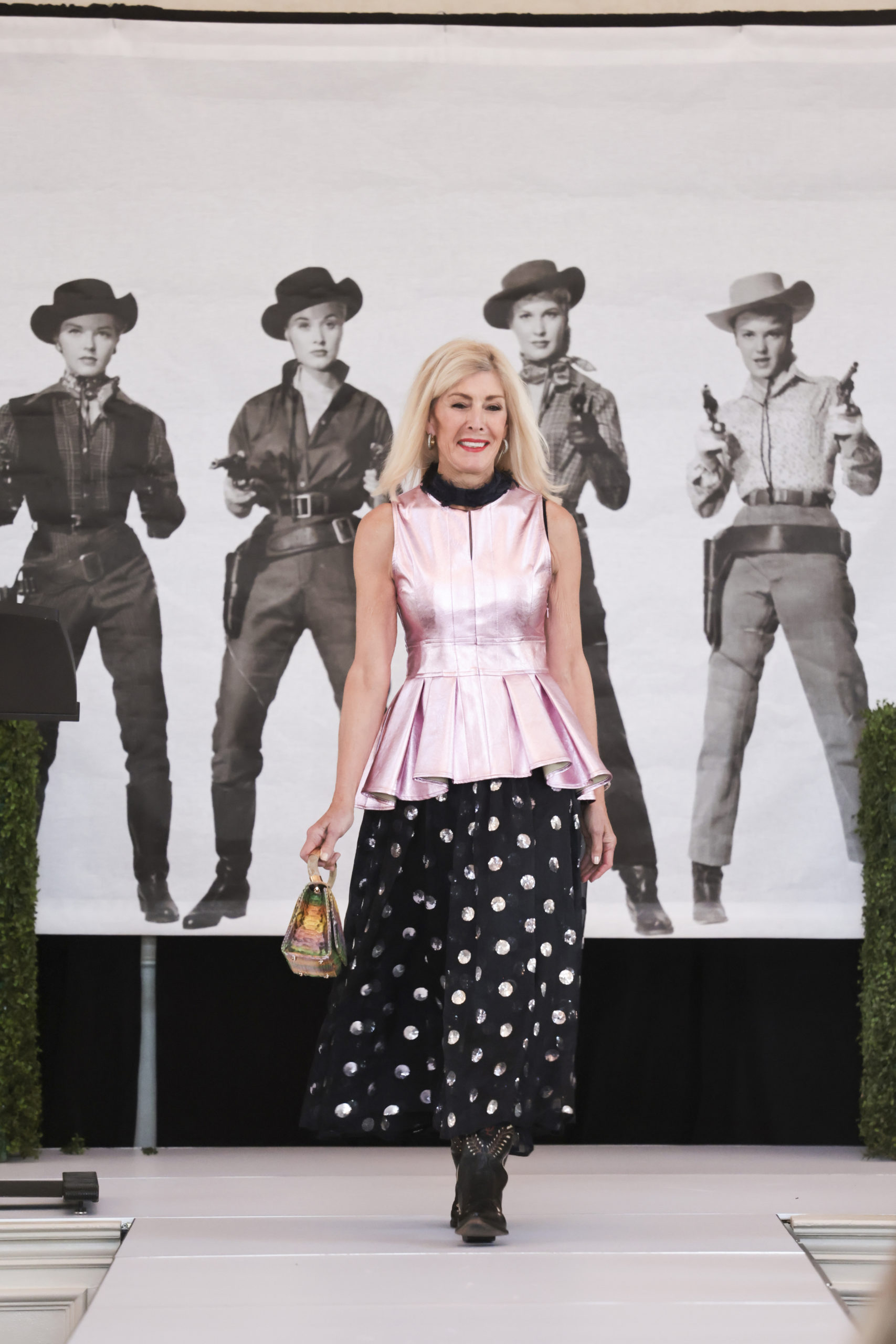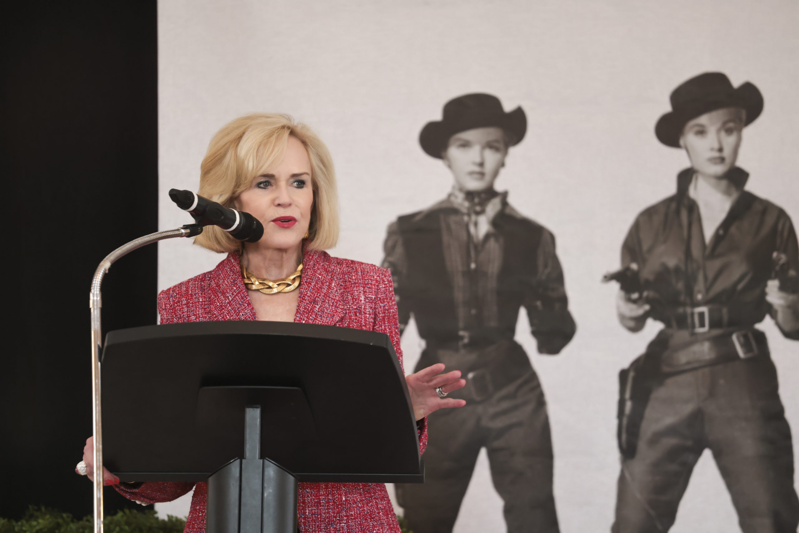 Adding to the excitement? A giant backdrop of the infamous Dalton Girls, guns drawn, behind the stage. After all, this exciting new event called the Desert Rose Luncheon benefited the National Cowgirl Museum and Hall of Fame.