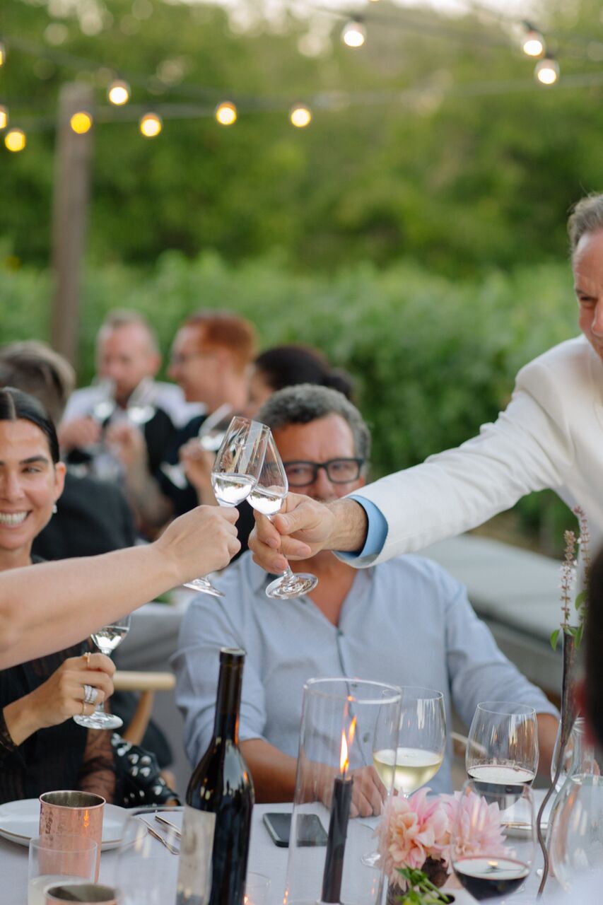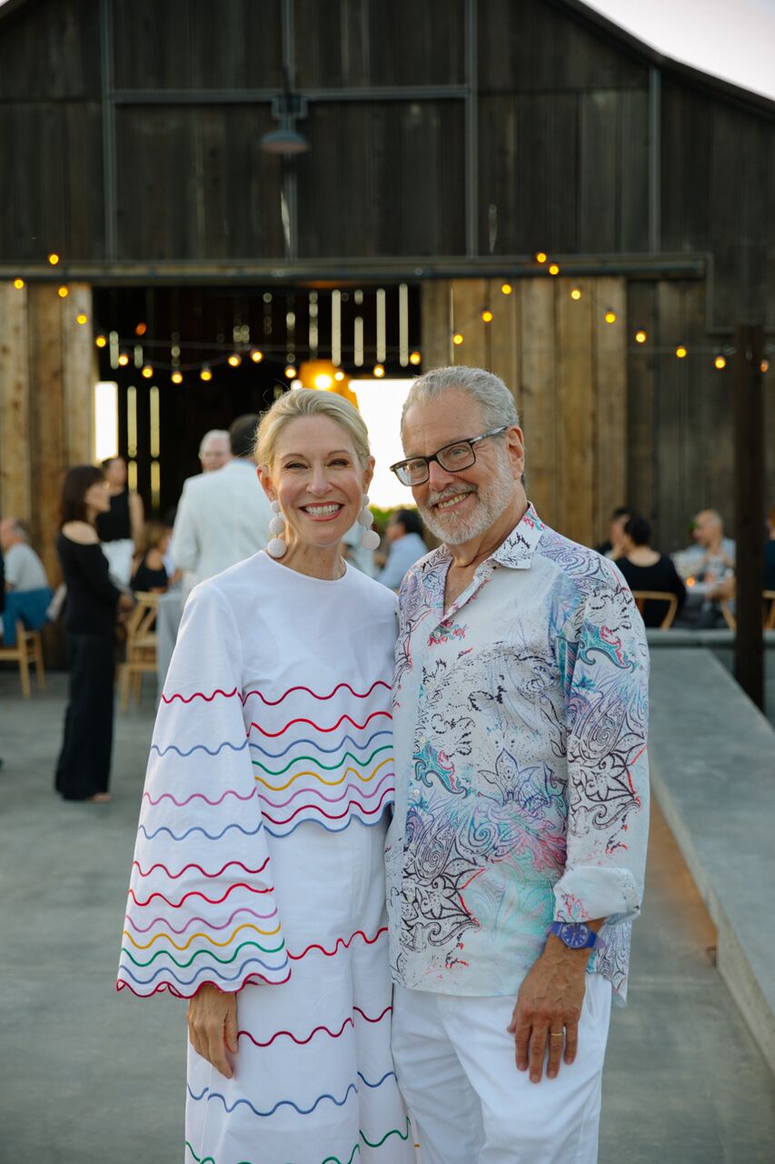 After cocktail hour, Cindy Rachofsky hosted a small VIP dinner at her Napa Valley home. A rustic-chic barn was decked out with twinkling lights, modern tablescapes, and understated florals for the occasion. Thomas Keller’s Ad Hoc catered the dinner with summery dishes such as TFL Garden Tomato Salad, Buttermilk Fried Chicken, Grilled Branzino and K+M Chocolate Pudding.