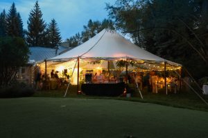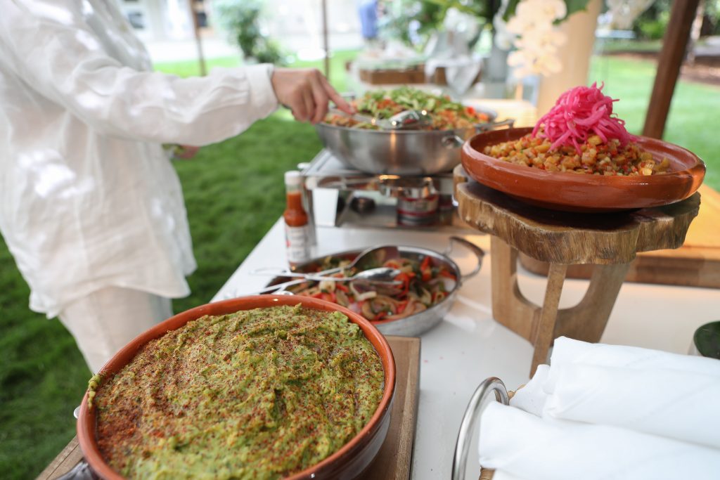 Guests visited beneath a white party tent that was elaborately decorated in South Florida chic with lush hanging ferns, strings of white party lights, and banana palm chandeliers overhead. While the Caribbean beats of a xylophone provided a festive note, guests grazed through buffet offerings of Latin and Cuban inspired cuisine.