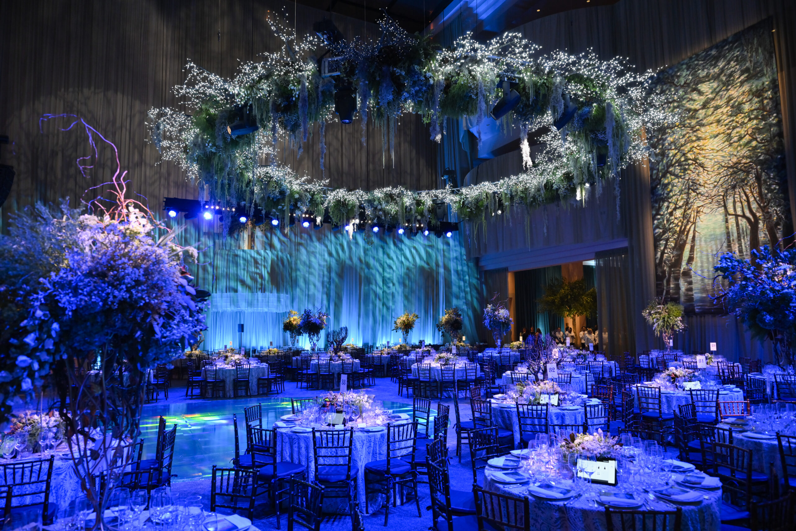 The crush of ballet supporters, 500 strong, schmoozed, wined, dined and danced beneath a glimmering halo embellished with greenery, flowers and cascades of moss channeling the forest in Giesle‘s second act. The soaring walls of the foyer were draped in pale green and a vast mural of woodlands added to the mystique of the setting. Blue and green lighting danced swirling patterns across the magical setting.