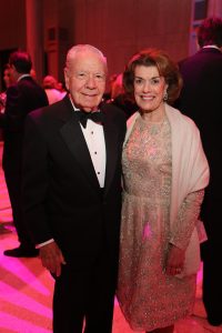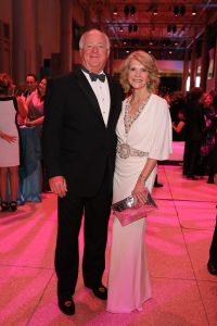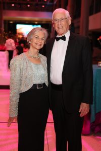 In their own personal salute to the theme, the chairs dressed accordingly — Weinzierl in a Cavalli gown featuring explosions of beading on a midnight background and Stephen’s gown in green, embellished with planets at the shoulder and the hemline, a design by her daughter Shelby.