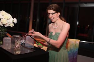 Setting the stage were dazzling fountains of fireworks that intermittently spewed from columns around the museum’s soaring grand hall where guests schmoozed over cocktails and where museum chemist Carolyn Leap mesmerized patrons with her experiment setting $5 bills afire, except, they did not burn due to her “secret” solution. Contributing to the out-of-this-world ambience, mixologists created galactic cocktails with liquid nitrogen.