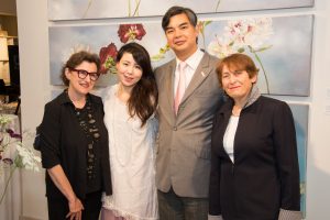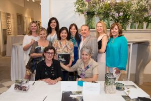 PC Moment: Basler debuted her exquisite floral paintings in the United States for the first time. The large canvases filled the showroom surrounded by the real-life beautiful blossoms that inspired them. Basler’s paintings transport the viewer to the artist’s profuse garden at her château near Vichy. Consul General Seam welcomed the distinguished crowd as they sipped coffee and teas and enjoyed classic French fare, including macaroons, mini croque monsieurs, and madeleines. (The exhibit will be on view weekdays through Friday, August 5.)