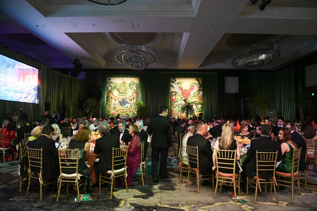In place of famed fan dancer Sally Rand, who was known for seducing in a cloud of fluttering ostrich plumes, Bali fire dancers welcomed guests with brilliant costuming and swirling that filled the dance floor until the 530 guests were seated for dinner. Though Frank Sinatra and Tony Bennett, who once performed at the original, weren’t exactly available, two members of the Rat Pack tribute group, “Sammy Davis Jr.” and “Dean Martin,” set the swishy tone of the evening, entertaining during dinner. Following, David Caceres and his orchestra took to the stage.