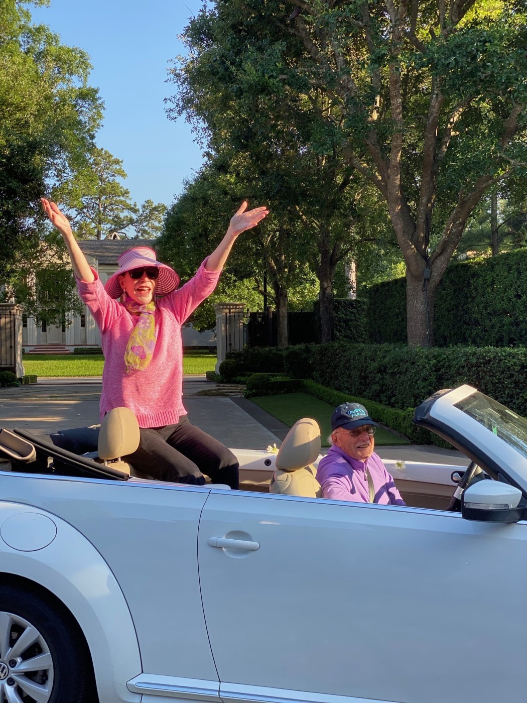 Anne and Dr. Jim Muntz — medical team physician for the Houston Rockets and Houston Astros, and team internal medicine physician for the Houston Texans — arrived with the top down on their convertible and shimmied two bright pink umbrellas as they did a mini second-line parade around the drive.