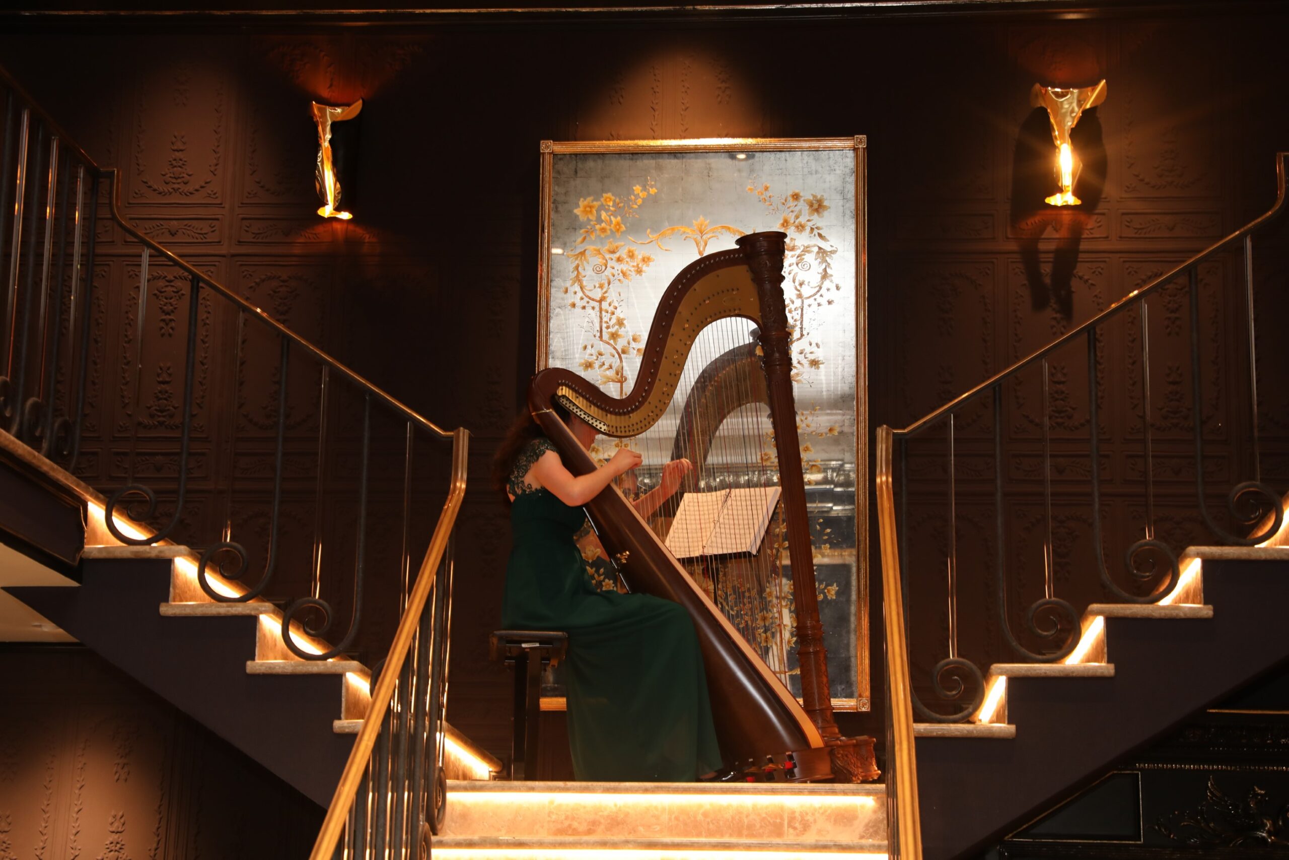 While a harpist played on the landing of the double stairway, erudite visitors speaking a multitude of languages schmoozed through the living and dining areas and moved onto the terrace, as large as a spacious apartment. Views of the downtown skyline, overlooks of River Oaks and the waterfall pouring into a swimming pool had several guests wondering when they might win the Texas lottery and really join the party.