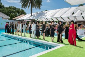 A first for the luncheon, models in matching wigs (though different colors) and designer fashions from Tootsies strolled the catwalk that circled the swimming pool. As Armanious explained, “If the models have simple wigs, you notice the clothes more than you notice the girls.”
