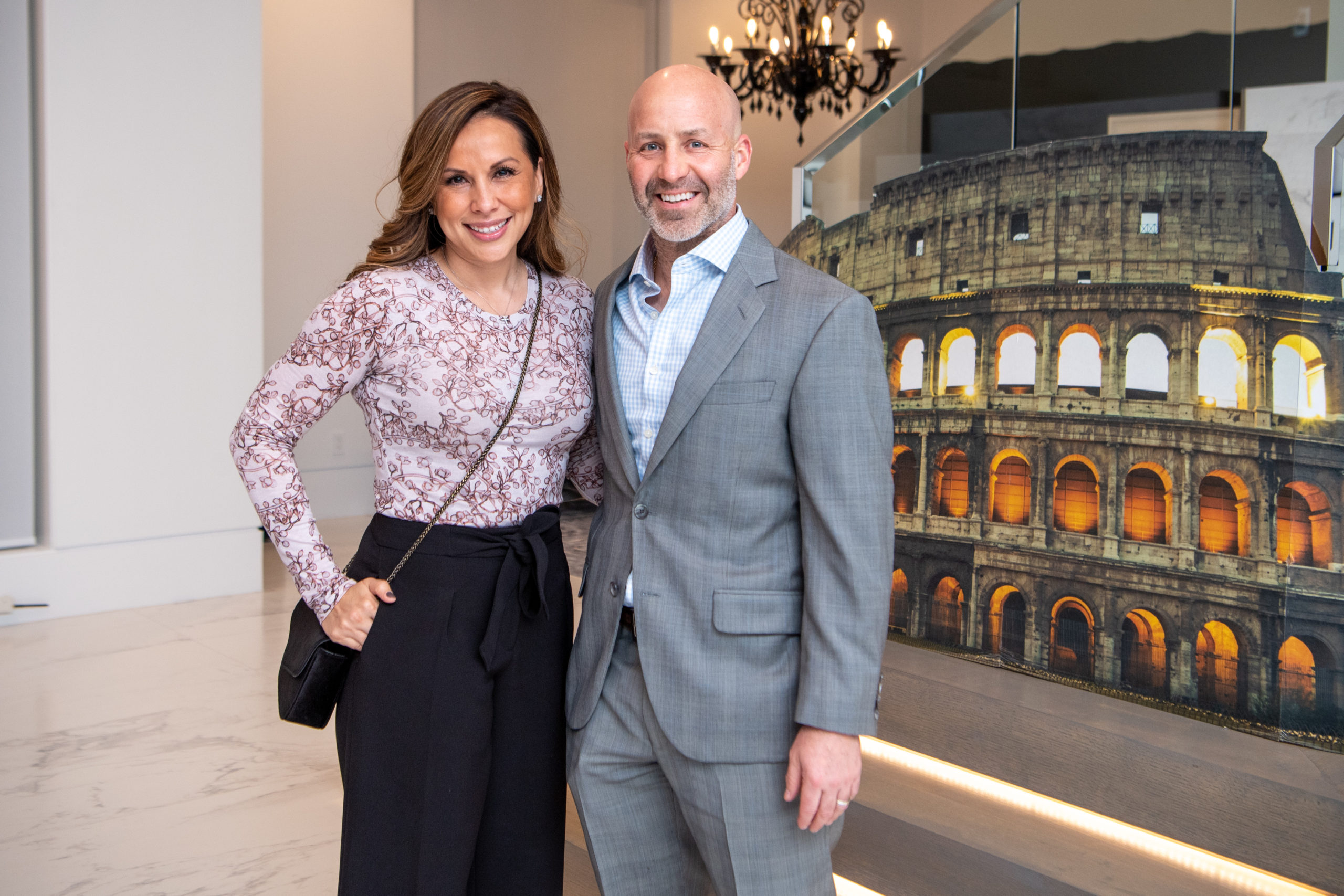 Let’s start with the site of the party. The uber contemporary home of Tina and Dan Silvestri, CEO and president of Silvestri Investments, welcomed close to 200 guests, who despite the valet parking mess along Memorial Drive, arrived ready to party. Setting the mood was a massive cutout of Rome’s Colosseum in the foyer and two electric scooters, which were offered in that evening’s silent auction.