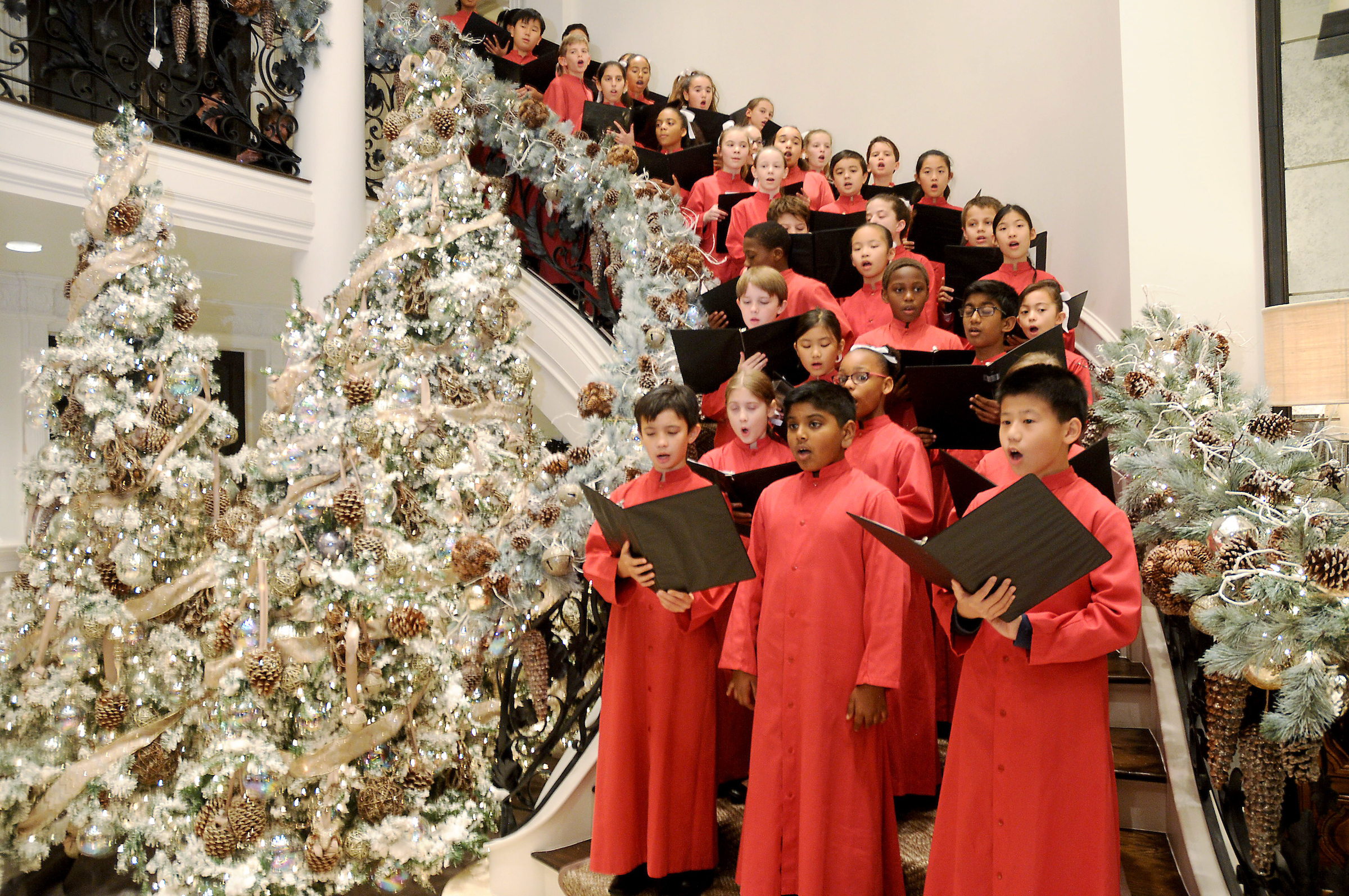 The Houston Children’s Chorus, filling the curving stairway to the second floor, greeted guests with their glorious songs of the season. Ready in the grand foyer for arrivals were M.D. Anderson newly-minted president Dr. Peter Pisters, introduced to new arrivals by executive director of development Mary Kathryn Cooper.