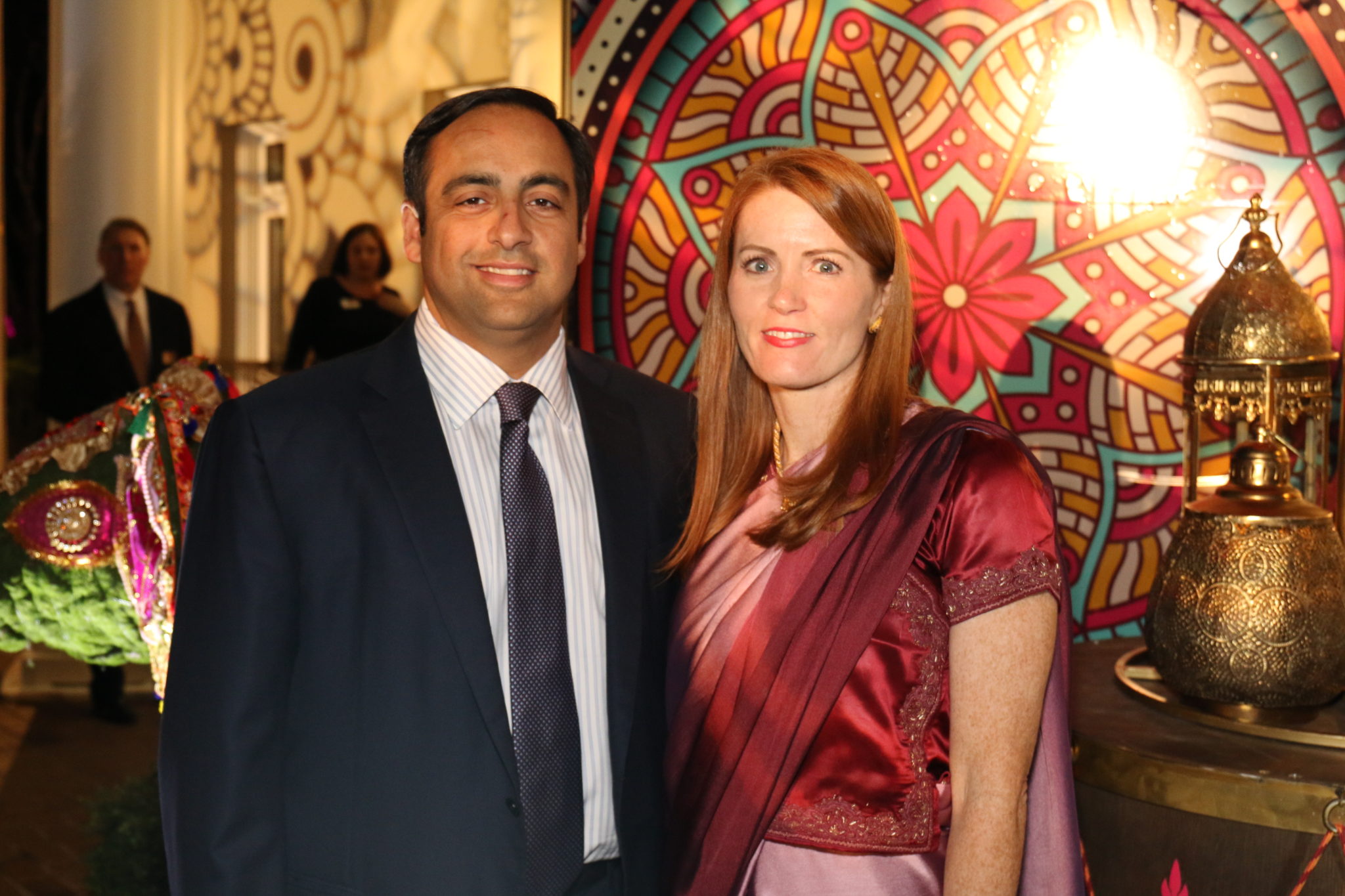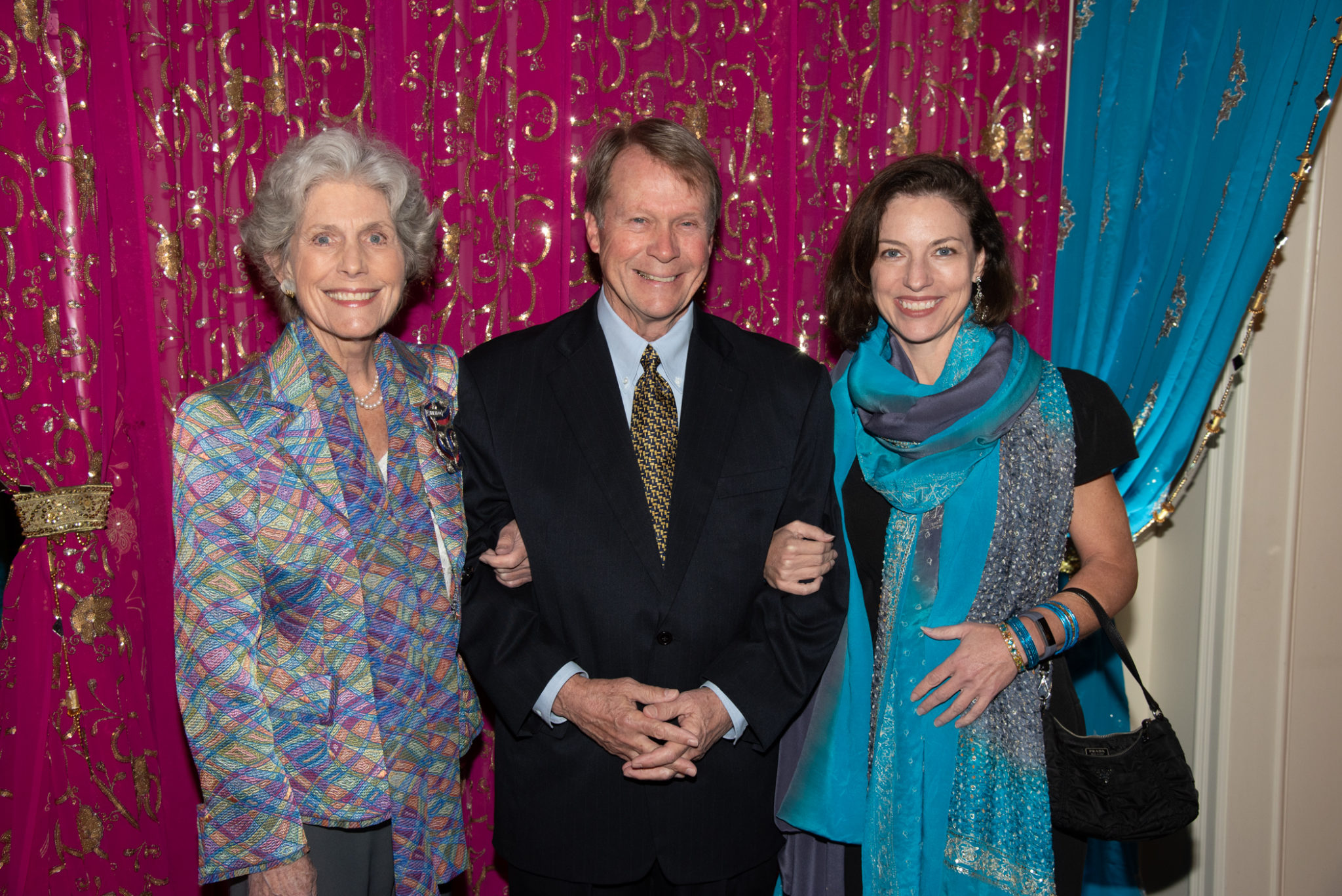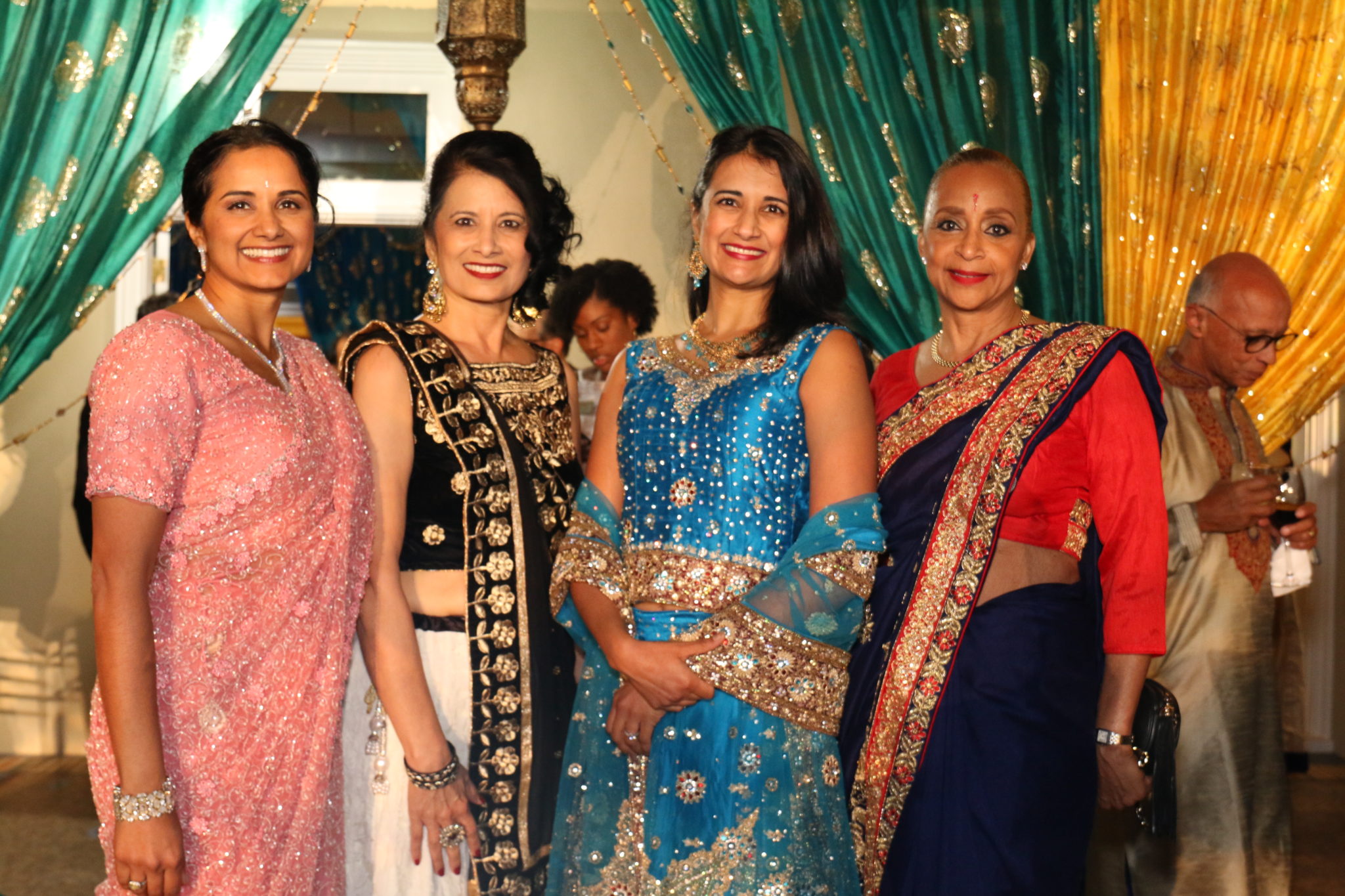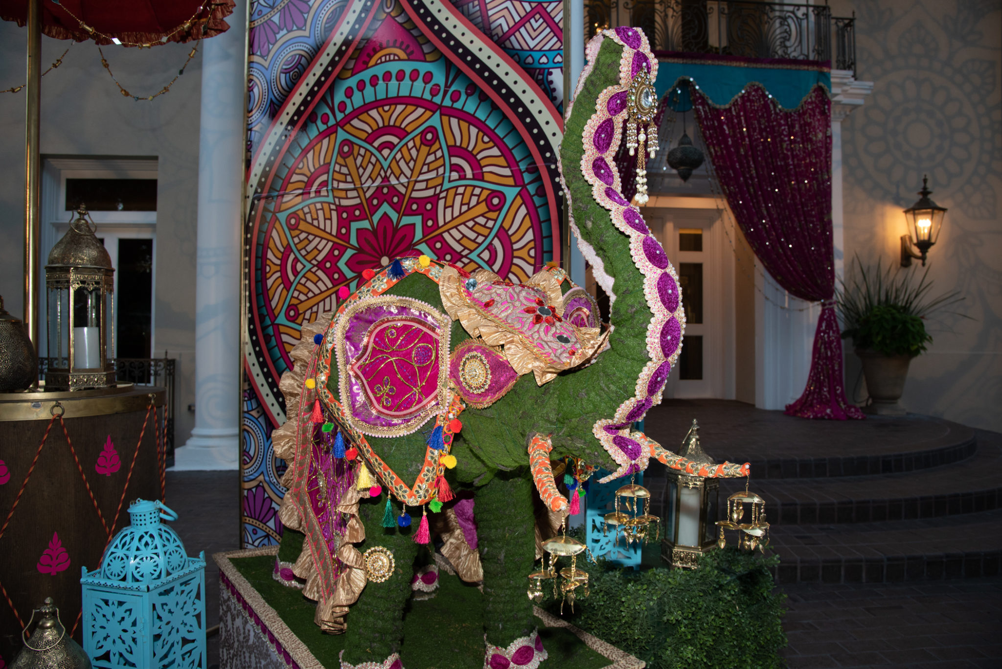 With the Khators’ Indian heritage as inspiration, the university pulled out the stops for more than 250 guests, the majority of whom dressed in Indian-inspired fashions. They were invited to roam the elegant dwelling and traverse the back garden for the strolling supper catered by Daawat Catering With a Twist and A Fare Extraordinaire. Both indoors and out, Prashe created an Indian fantasy with swaths of glittering, embroidered silk curtains and table covers, all draped in spangles and ropes of “jewels.” Bejweled elephants (sacred animals to Hindus) held watch on the front doorstep as well as throughout the house and garden.