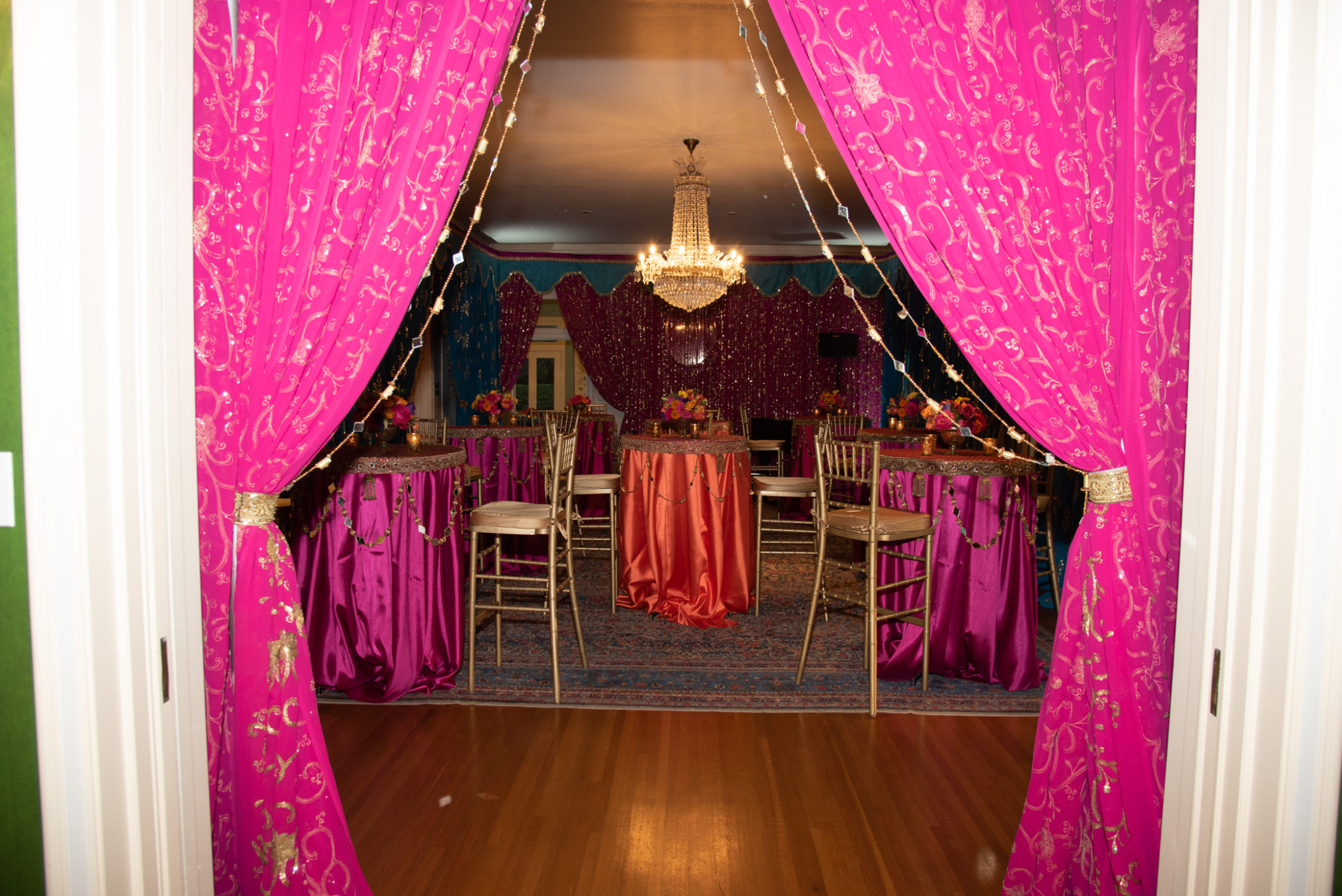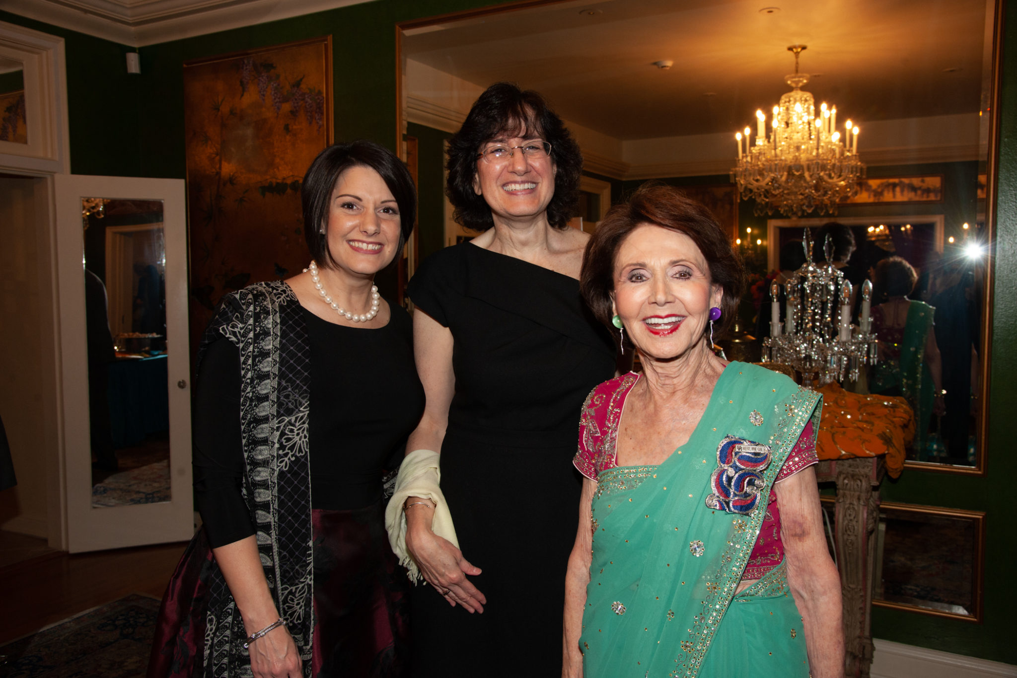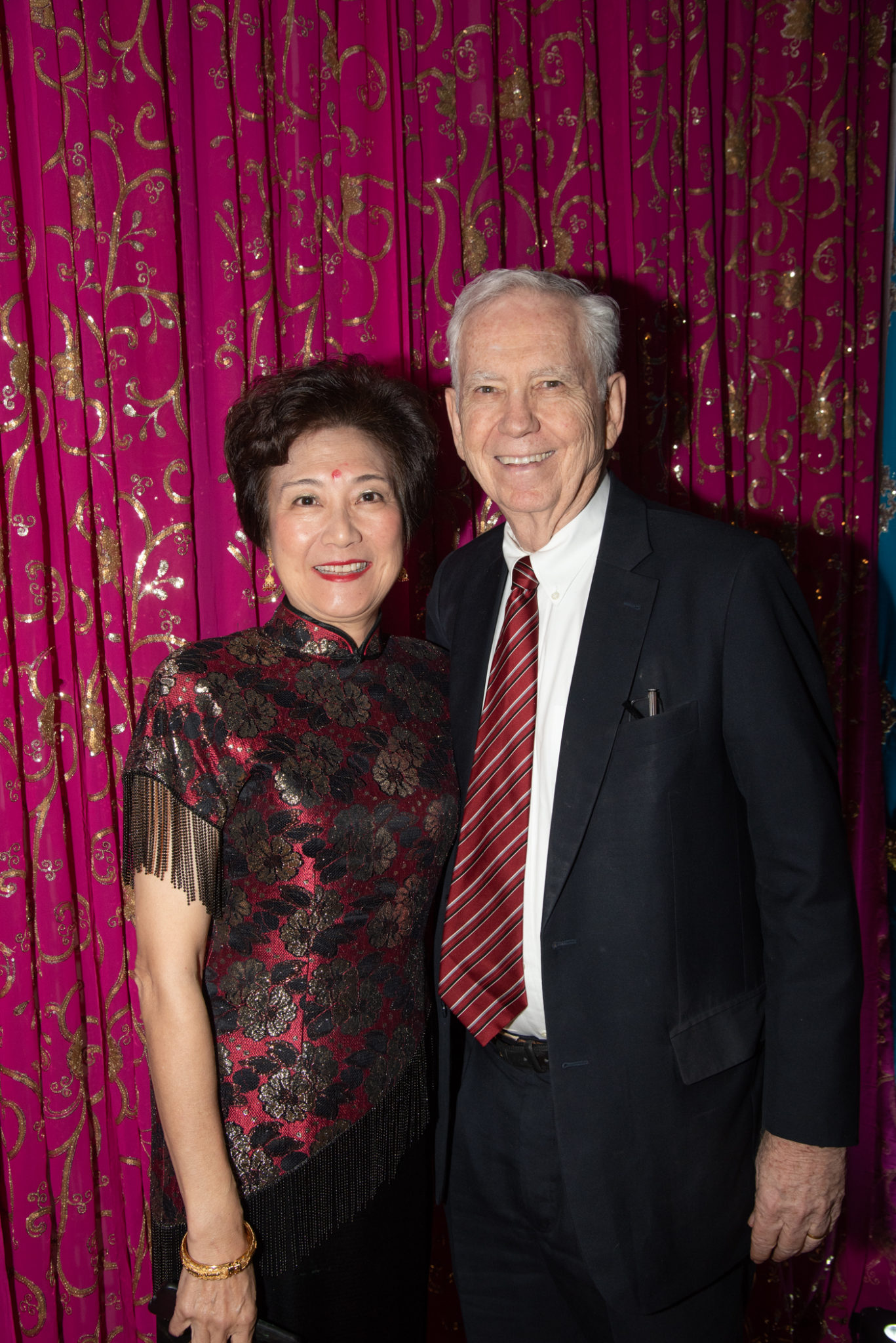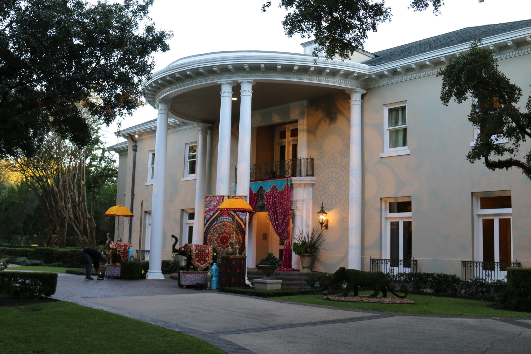 With the Khators’ Indian heritage as inspiration, the university pulled out the stops for more than 250 guests, the majority of whom dressed in Indian-inspired fashions. They were invited to roam the elegant dwelling and traverse the back garden for the strolling supper catered by Daawat Catering With a Twist and A Fare Extraordinaire. Both indoors and out, Prashe created an Indian fantasy with swaths of glittering, embroidered silk curtains and table covers, all draped in spangles and ropes of “jewels.” Bejweled elephants (sacred animals to Hindus) held watch on the front doorstep as well as throughout the house and garden.