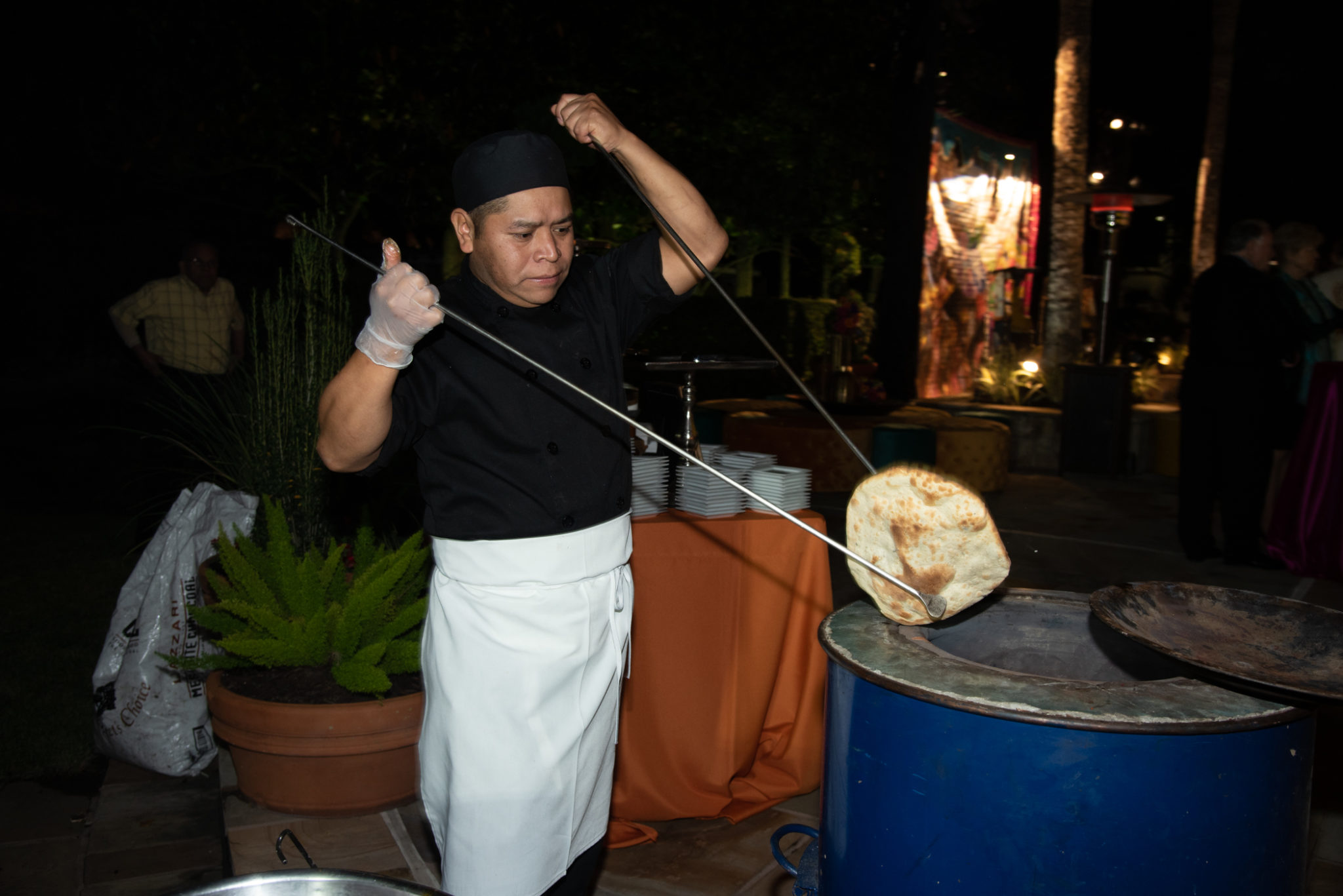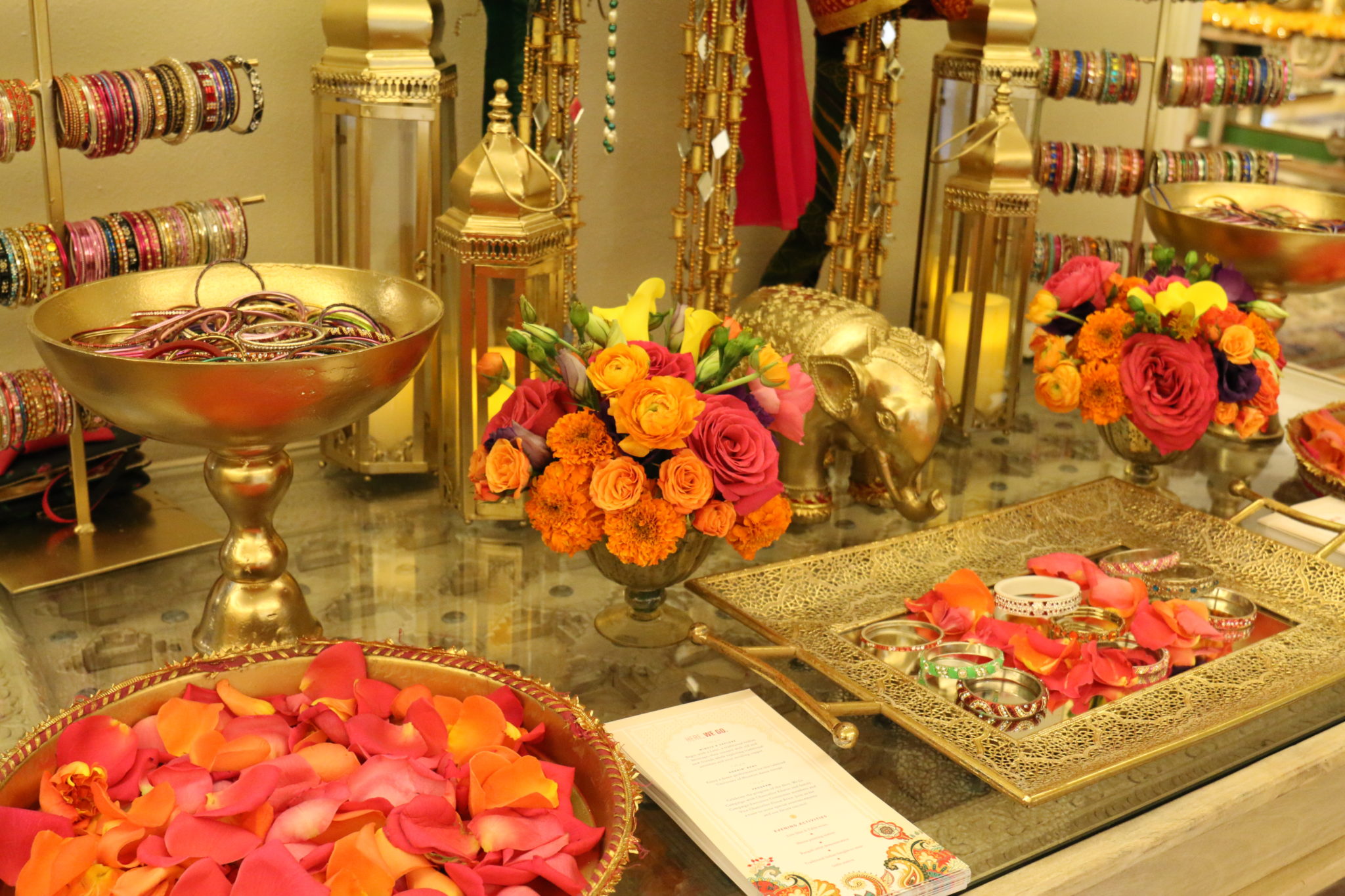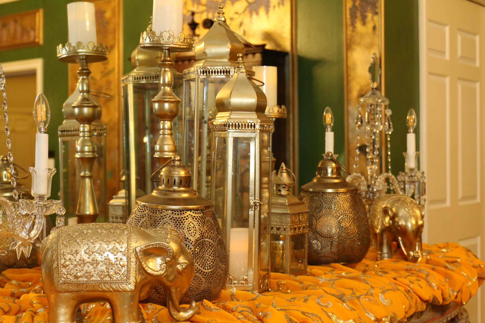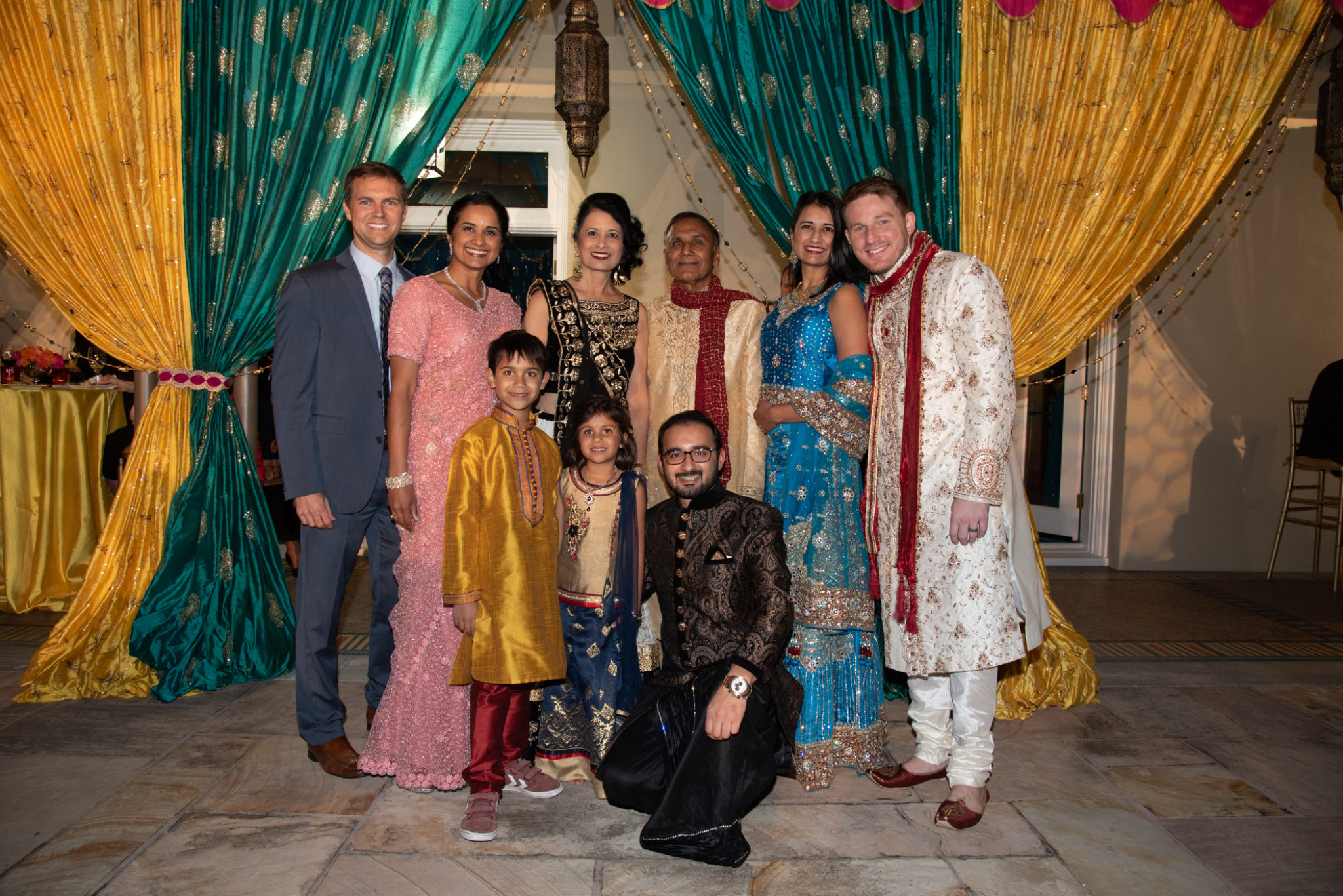With the Khators’ Indian heritage as inspiration, the university pulled out the stops for more than 250 guests, the majority of whom dressed in Indian-inspired fashions. They were invited to roam the elegant dwelling and traverse the back garden for the strolling supper catered by Daawat Catering With a Twist and A Fare Extraordinaire. Both indoors and out, Prashe created an Indian fantasy with swaths of glittering, embroidered silk curtains and table covers, all draped in spangles and ropes of “jewels.” Bejweled elephants (sacred animals to Hindus) held watch on the front doorstep as well as throughout the house and garden.